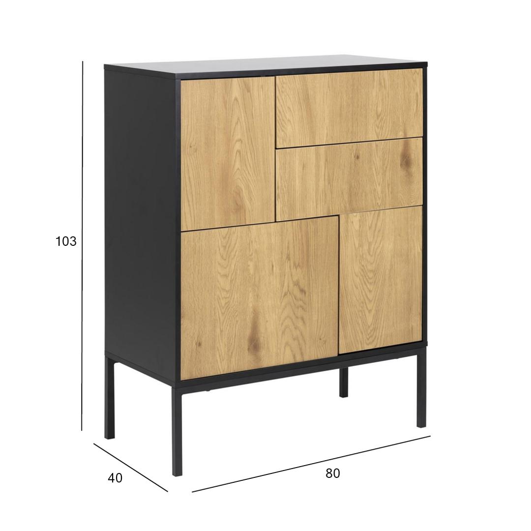Sideboard SEAFORD 80x40xH103cm. This sideboard puts the sophisticated industrial design on full display with its wild oak effect and a contrasting black frame with rough powder coated metal base. Defined by clean lines and push to open function, this design has a contemporary yet hearty soul that warms up any room. It also provides spacious storage. There are 2 drawers and 4 compartments to fill. Frame MDF, painted, matt black, 3 doors, wild oak look, 2 drawers, metal legs. CARE: Generally, painted surfaces are low maintenance. Any spills must be instantly removed with a cloth wrung in mild soapy water and make sure to wipe dry along the grains of the wood. Do not scuff the surface with hard objects. Kummut SEAFORD 80x40xH103cm. Kapi disainis on kombineeritud metsik tamm ja kontrastne must raam. Selgete joontega funktsionaalne kapp on kaasaegne, kuid soojendab iga ruumi. Kapis on piisavalt panipaiga ruumi. Raam: MDF, värvitud, matt must. Uksed: lamineeritud kattega mööbliplaat. Mettaljalad. HOOLDUS: Üldjuhul vajavad värvitud pinnad vähe hoolt. Kõik plekid tuleb koheselt eemaldada seebiveest kuivaks väänatud lapiga ja pühkida pind kuivaks. Ärge hõõruge pinda kõvade esemetega.