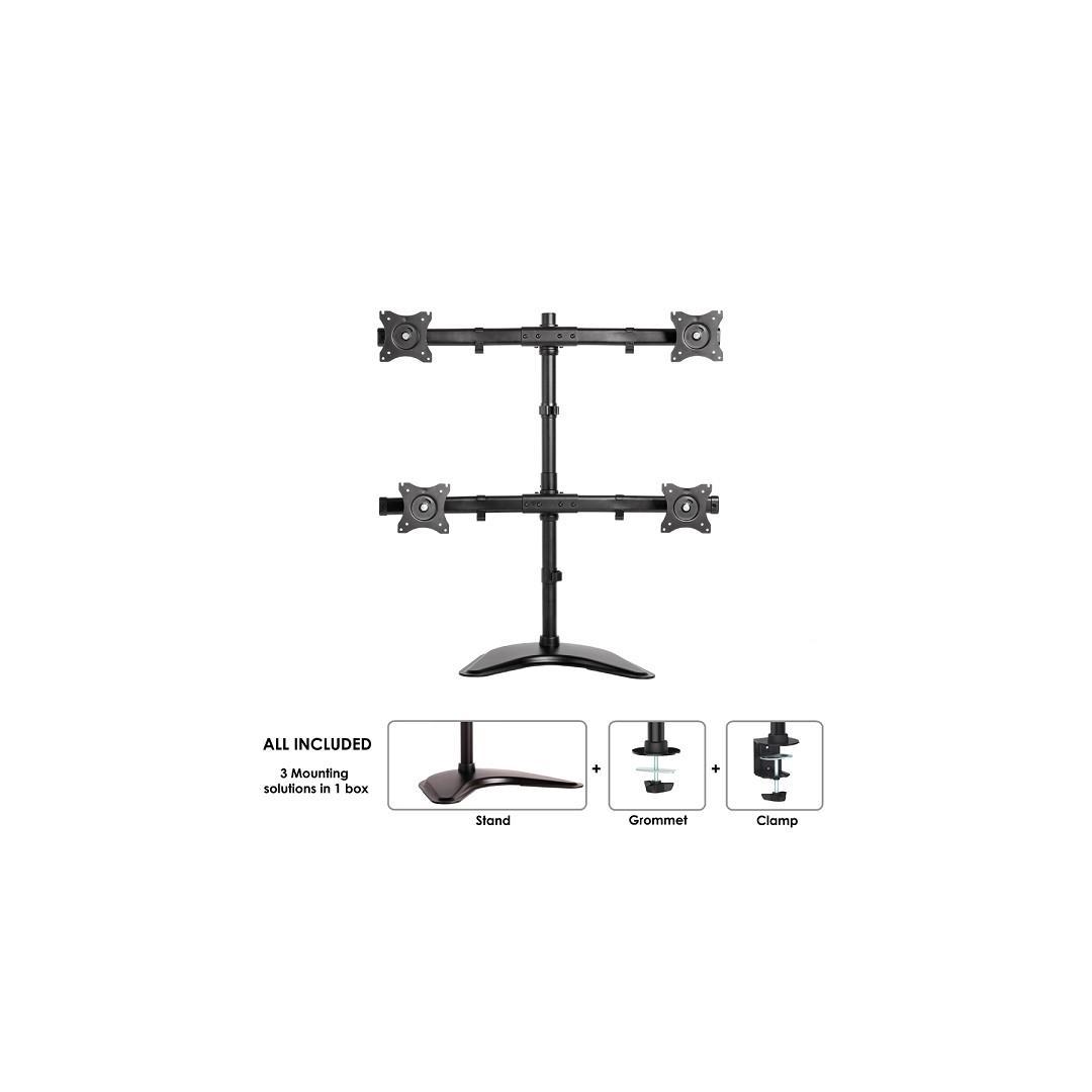 The Neomounts Select desk mount, model NM-D335D4BLACK is a tilt-, swivel and rotatable desk mount for 4 flat screens up to 27?. This mount is a great choice for space saving placement on desks using a desk clamp, desk stand or desk grommet. Neomounts Select's versatile tilt (90°), rotate (360°) and swivel (30°) technology allows the mount to change to any viewing angle to fully benefit from the capabilities of the flat screen. The mount is manually height adjustable from 0 to 80 centimetres.An innovative cable management conceals and routes cables from mount to flat screen. Hide your cables to keep the workplace nice and tidy. Neomounts Select NM-D335D4BLACK has one pivot point and is suitable for 4 screens up to 27" (69 cm). The weight capacity of this product is 8 kg each screen. The desk mount is suitable for screens that meet VESA hole pattern 75x75 or 100x100mm. Different hole patterns can be covered using Neomounts Select VESA adapter plates. By using an ergonomic mount neck- and back complaints can be avoided. Ideal for use in offices and on counters or in a reception area. All installation material is included with the product.
