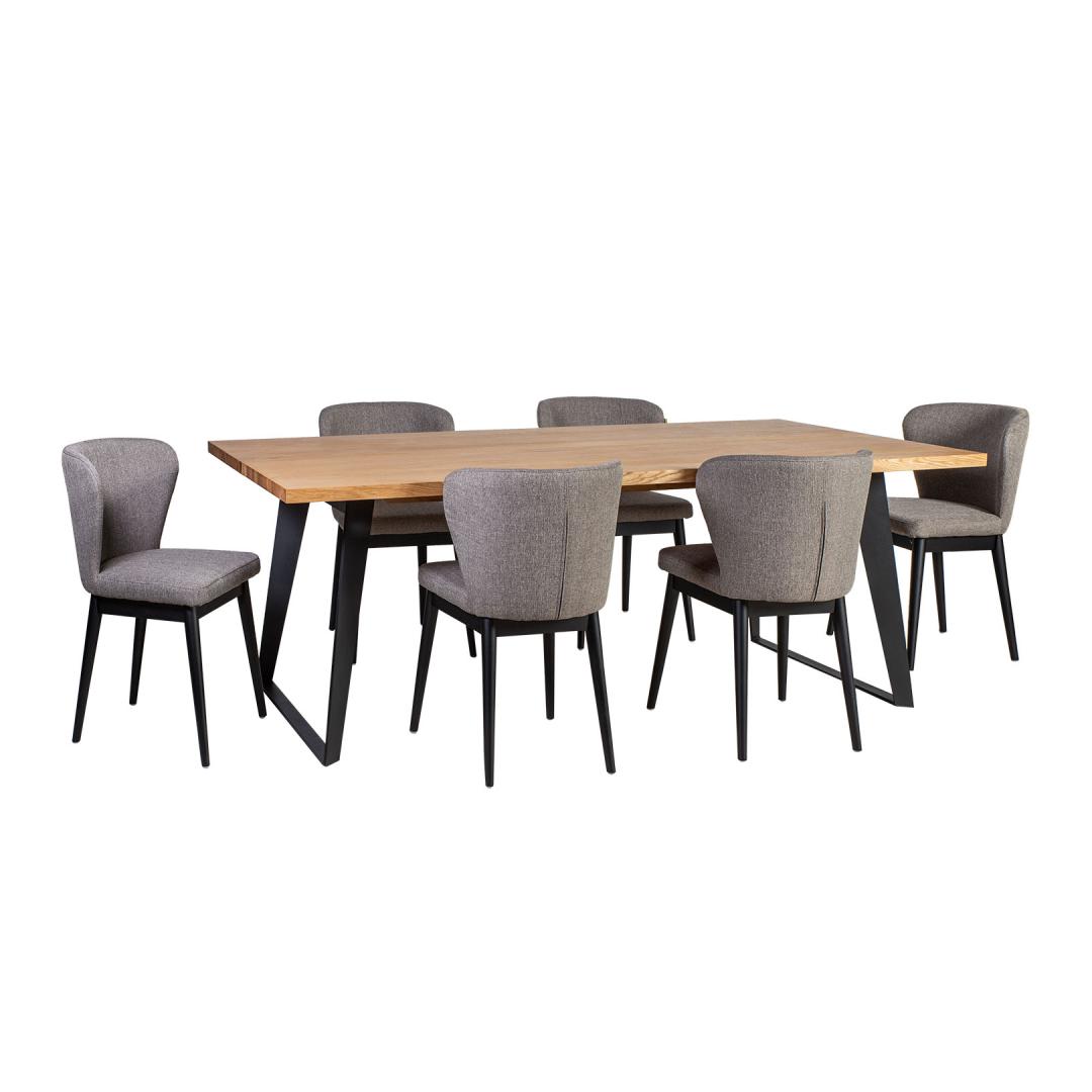 Dining set LISBON table and 6 chairs. A large dining table with well-chosen chairs is the heart of the home. Dining set LISBON is a great choice for both traditional and more modern style interiors. It is possible to buy a 50cm extension plate (code 18102) at one or both ends of the table, which can be used to create up to 3 + 3 seats. The extension plates are not included in the set. The tabletop with solid wood edging is made of particle board and covered with oil-treated natural oak veneer. Metal legs are coated with black powder paint. The upholstered seat and back rest of the chair are covered with polyester fabric. The legs and base frame are made of solid wood and finished in black paint. The dimensions of the table are 220x100xH75cm. The dimensions of the chair are 53,5x54xH81,5cm, weight limit 100kg. CARE: protect the veneered surface from liquids. Any liquid that gets on the table should be wiped off immediately with a soft, slightly damp cloth. Always use table mats and hotplates. Söögilauakomplekt LISBON 6-tooliga. Suur söögilaud koos hästi valitud toolidega on kodu süda! Söögilauakomplekt LISBON suurepärane valik nii traditsioonilise, kui modernsema stiiliga interjööri. Laua ühte või mõlemasse otsa on võimalik juurde osta 50cm pikendus (kood 18102), mille abil saab tekitada lisaks kuni 3 + 3 istumiskohta. Massiivne, mööbliplaadist valmistatud lauaplaat on kaetud naturaalse tammespooniga. Lauaplaadi äärtes on täispuidust liistud. Lauaplaat on viimistletud õliga. Metallist jalad on kaetud musta pulbervärviga. Tooli iste ja seljatugi on polsterdatud ja kaetud halli polüesterkanaga. Tooli jalad ja alusraam on valmistatud täispuidust ja viimistletud musta värviga. Laua mõõdud on 220x100xH75cm. Tooli mõõdud on53,5x54xH81,5cm, kaalupiirang 100kg. HOOLDUS: kaitske spoonitud pinda vedelike eest. Igasugune lauale sattunud vedelik tuleb koheselt pühkida pehme, õrnalt niiske lapiga. Kasutage alati lauamatte ja kuumaaluseid.