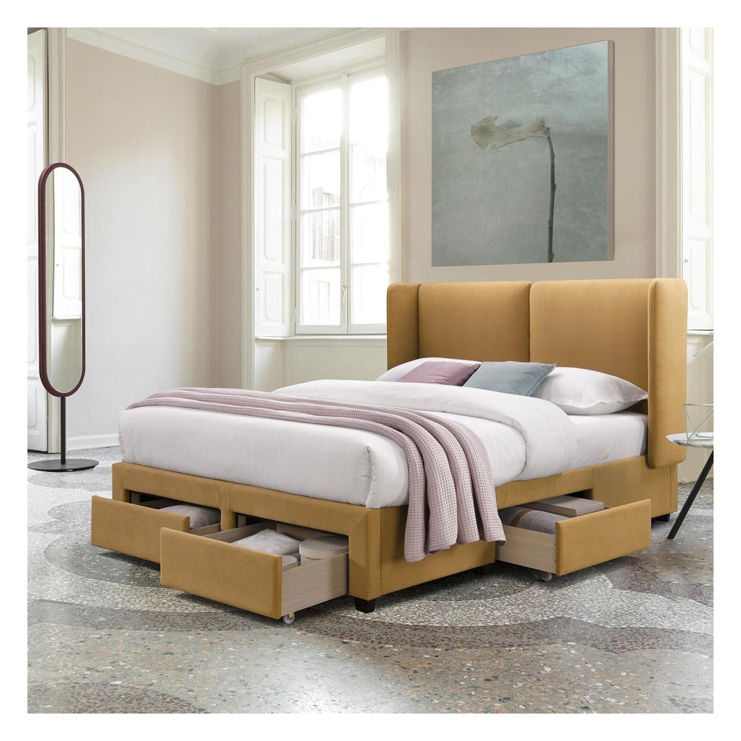 Bed SUGI with mattress HARMONY DELUX 160x200cm, yellow. The body of the bed is made of wood and furniture board and covered with polyester fabric. The padded high headboard allows you to comfortably read or watch TV in bed. There are four drawers on wheels inside the base frame of the bed. The set includes bed base slats and a mattress HARMONY DELUX. The firm natural latex mattress has packed deluxe pocket springs (2,3mm/firm). The stretch fabric cover is made of soft and skin-friendly cotton polyester (weight 410g/m2). The top layer of the mattress is natural latex, which helps you to fully relax by contouring your body shape to relieve tension and provide support. The mattress has two different high-quality profiled foam layers, which provide maximum muscle and skeletal relaxation. The fabric, felt and wadding meet the international Oeko-Tex 100 standard. The mattress is packed in a roll to make it easier to transport. The mattress needs up to 2 hours to restore its original shape. Carefully remove the plastic bags and place the mattress on the bed. The dimensions of the mattress are 160x200xH30cm. The overall dimensions of the bed are 175x218xH114cm. Voodi SUGI madratsiga HARMONY DELUX 160x200cm, kollane. Voodi korpus on valmistatud puidust ja mööbliplaadist ning kaetud polüesterkangaga. Polsterdatud kõrge peats võimaldab voodis mõnusalt lugeda või telerit vaadata. Voodi alusraami sees on neli ratastel liikuvat sahtlit. Komplekt sisaldab voodi põhjalippe ja madratsit HARMONY DELUX. Jäigema vedrustusega ja naturaalse lateksi kihiga kvaliteetne vedrumadrats on kõrgusega 30cm. Madratsil on pakitud deluxe-pocket vedrustus (2,3mm/jäik). Hele stretch-kangast madratsikate on nahasõbralikust ja pehmest puuvilla-polüestrist (kangakaal 410g/m²). Madratsis on pealmiseks kihiks naturaalne lateks, mis on pehme, elastne, õhku läbilaskev ning reguleerib ise oma niiskussisaldust. Lisaks on madratsis kaks erinevat kvaliteetset poroloonikihti, mis tagavad lihaste ja luustiku maksimaalse lõdvestuse. Kangas, vilt ja vatiin vastavad rahvusvahelisele Öko-Tex 100 standardile. Madrats on pakitud rulli, et seda oleks lihtsam transportida. Madrats vajab oma esialgse kuju taastamiseks kuni 2 tundi aega. Eemaldage ettevaatlikult kilepakend ja asetage madrats voodile. Madratsi mõõdud on 160x200xH30cm. Voodi üldmõõdud on 175x218xH114cm.