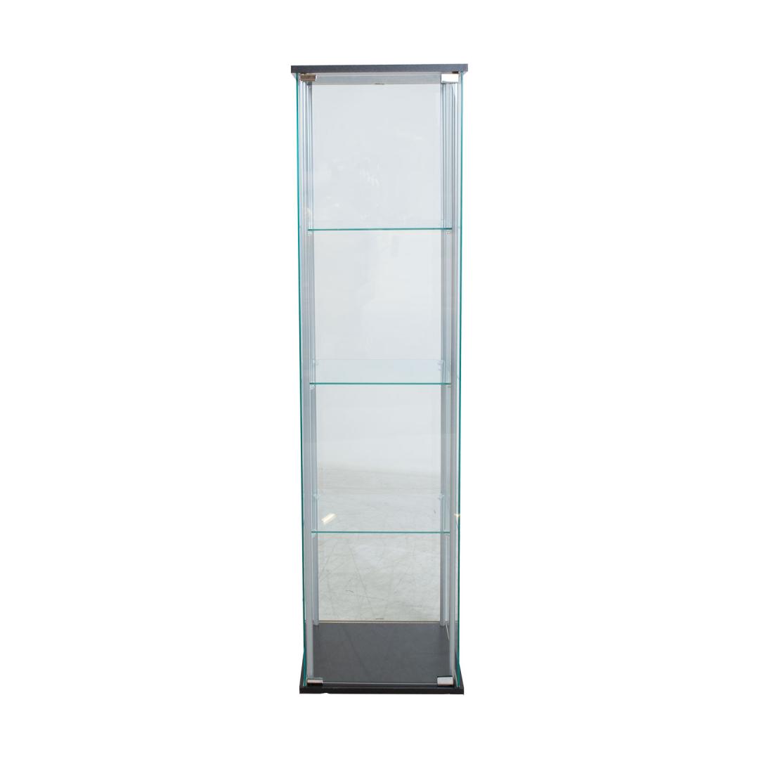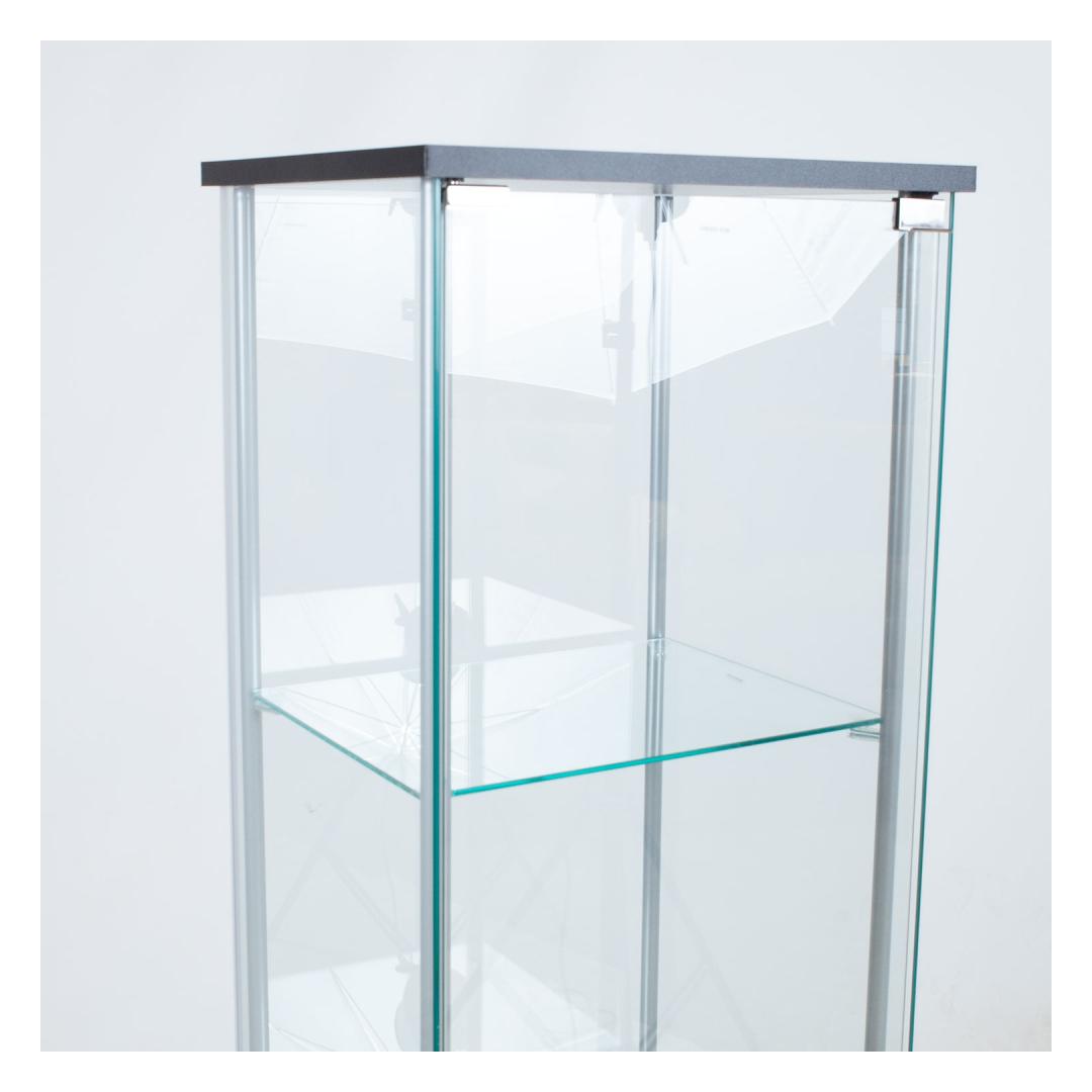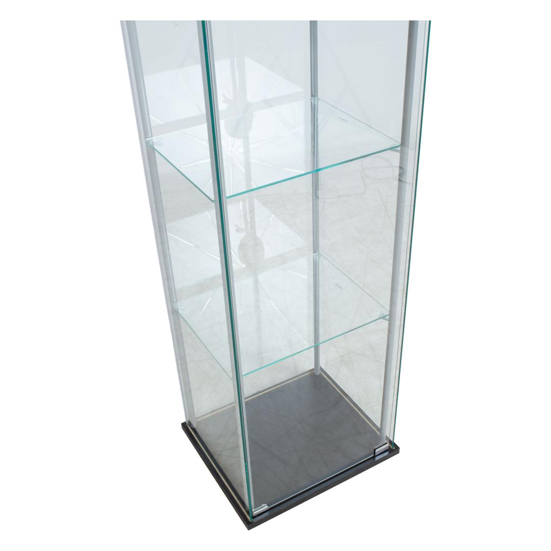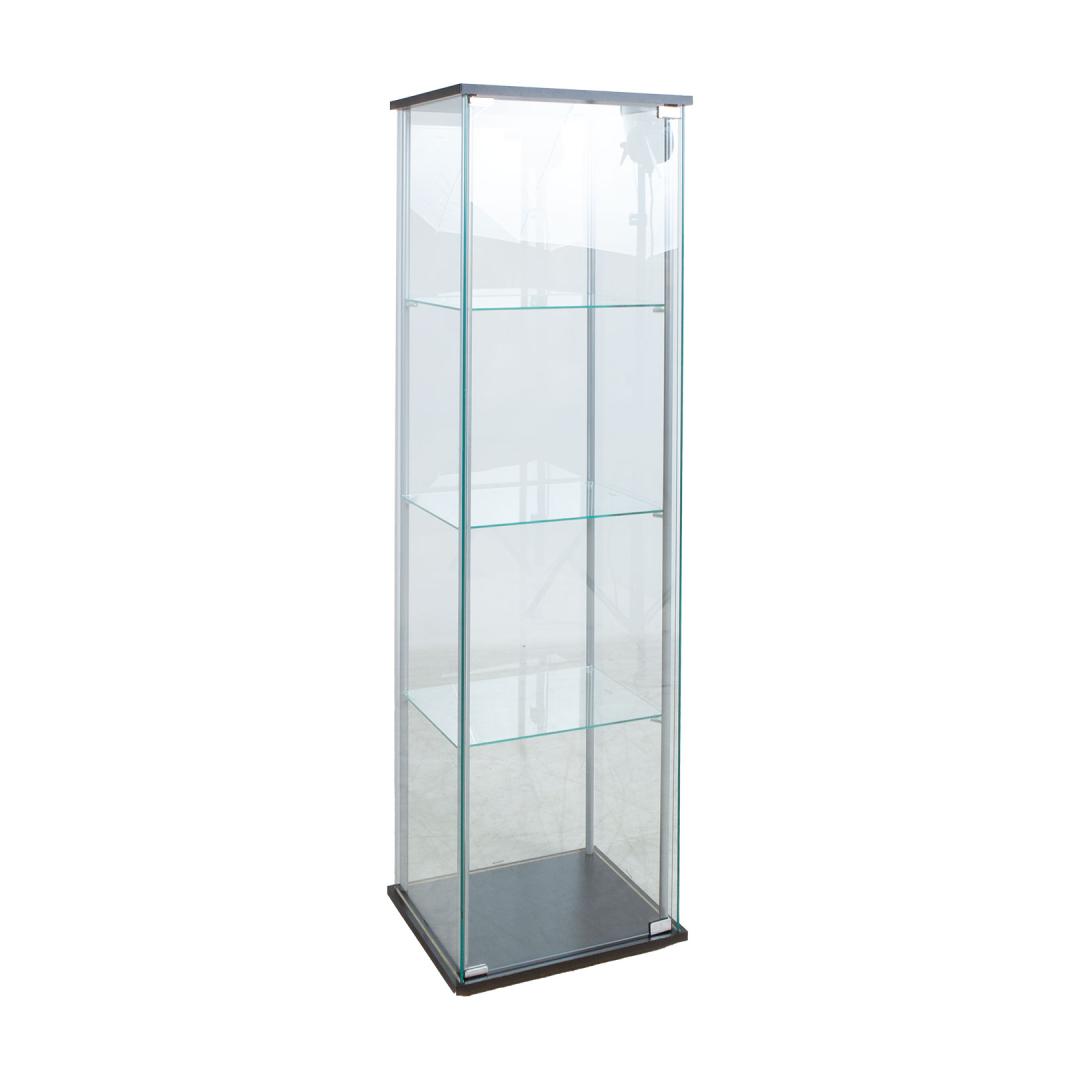 Vitriinkapp AIKO 42x36xH161cm. Õhulise klaasist vitriinkapi küljepostideks on hõbedased metalltorud. Vitriinkapi alus ja katus on valmistatud mustast lamineetplaadist. Kõik seinad, uks ja 3 vaheriiulit on tehtud 5mm karastatud klaasist.
