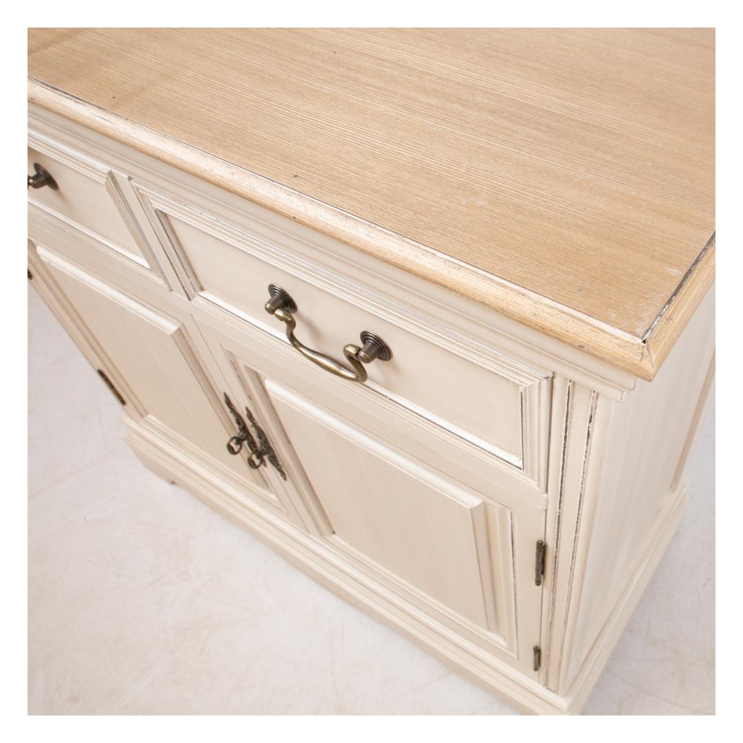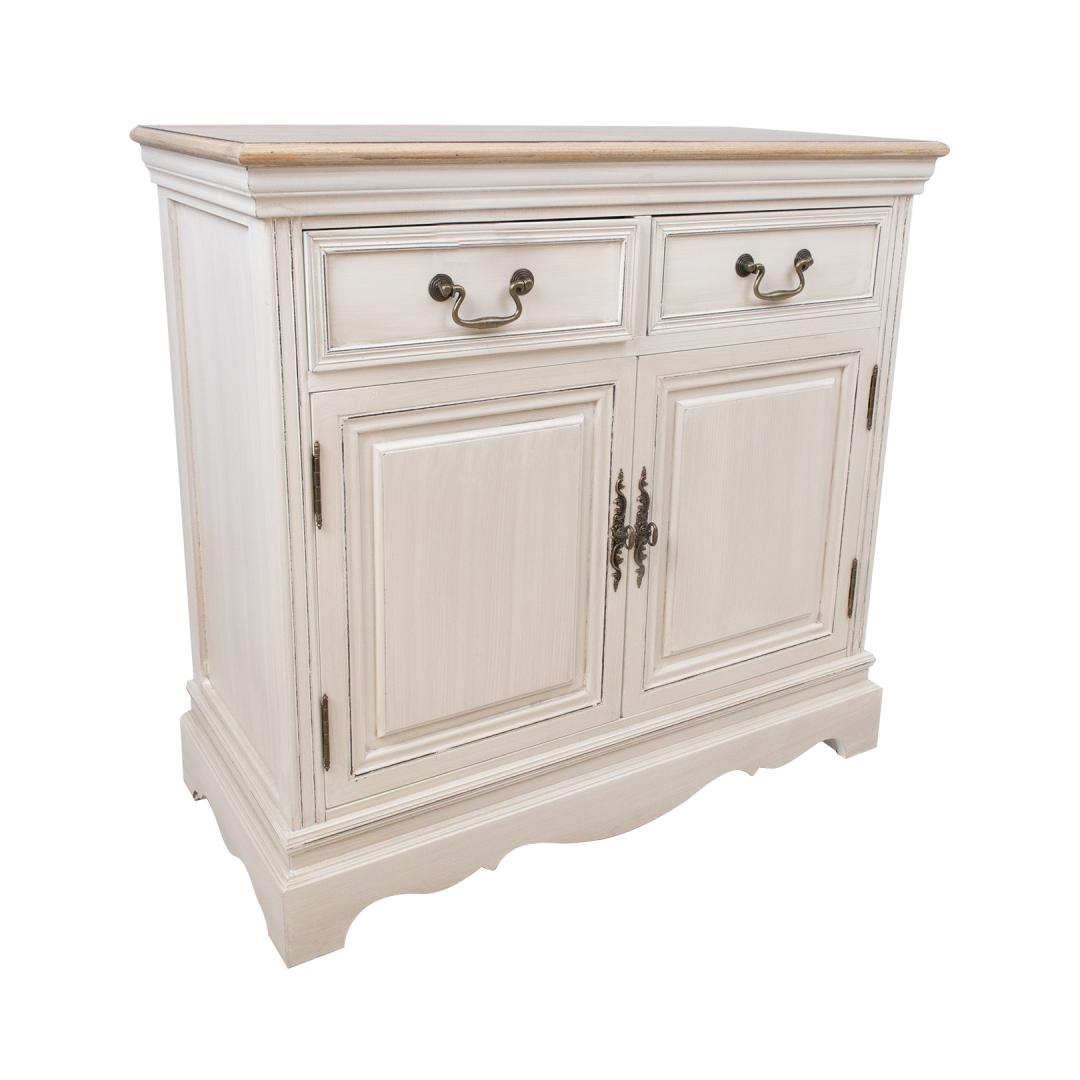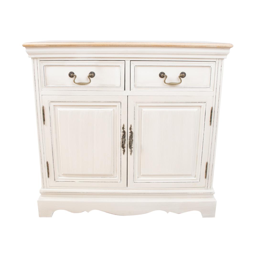 Sideboard SAMIRA with 2-doors and 2-drawers, 85x39xH82cm, color: antique white/brown. Wood: ash/paulownia/MDF, finish: painted. Kummut SAMIRA 2-ukse ja 2-sahtliga, 85x39xH82cm. Pealmine plaat: antiikpruun, raam/sahtlid: antiikvalge. 2 sahtlit ja 2 kapiust metallist käepidemetega. Sahtlid ilma siinideta. 2 ukse taga on kapis 1 riiul. Laineline sokliäär. Puit: saar, paulownia, viimistlus: värvitud.