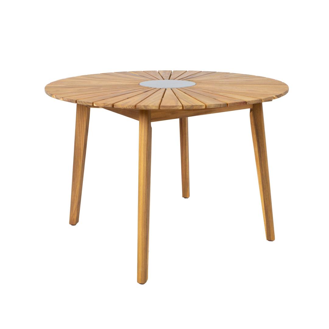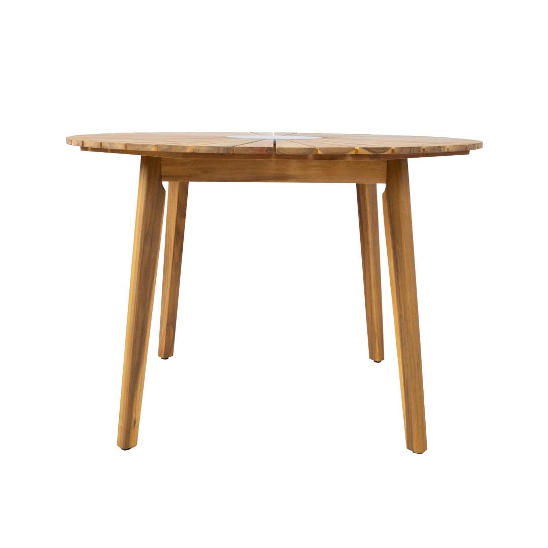 The table is made of acacia wood and finished with teak-colored wood preservative oil.