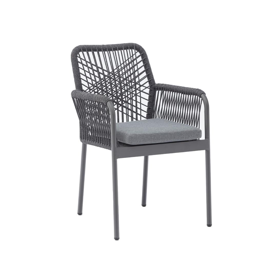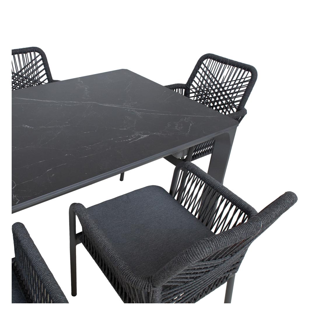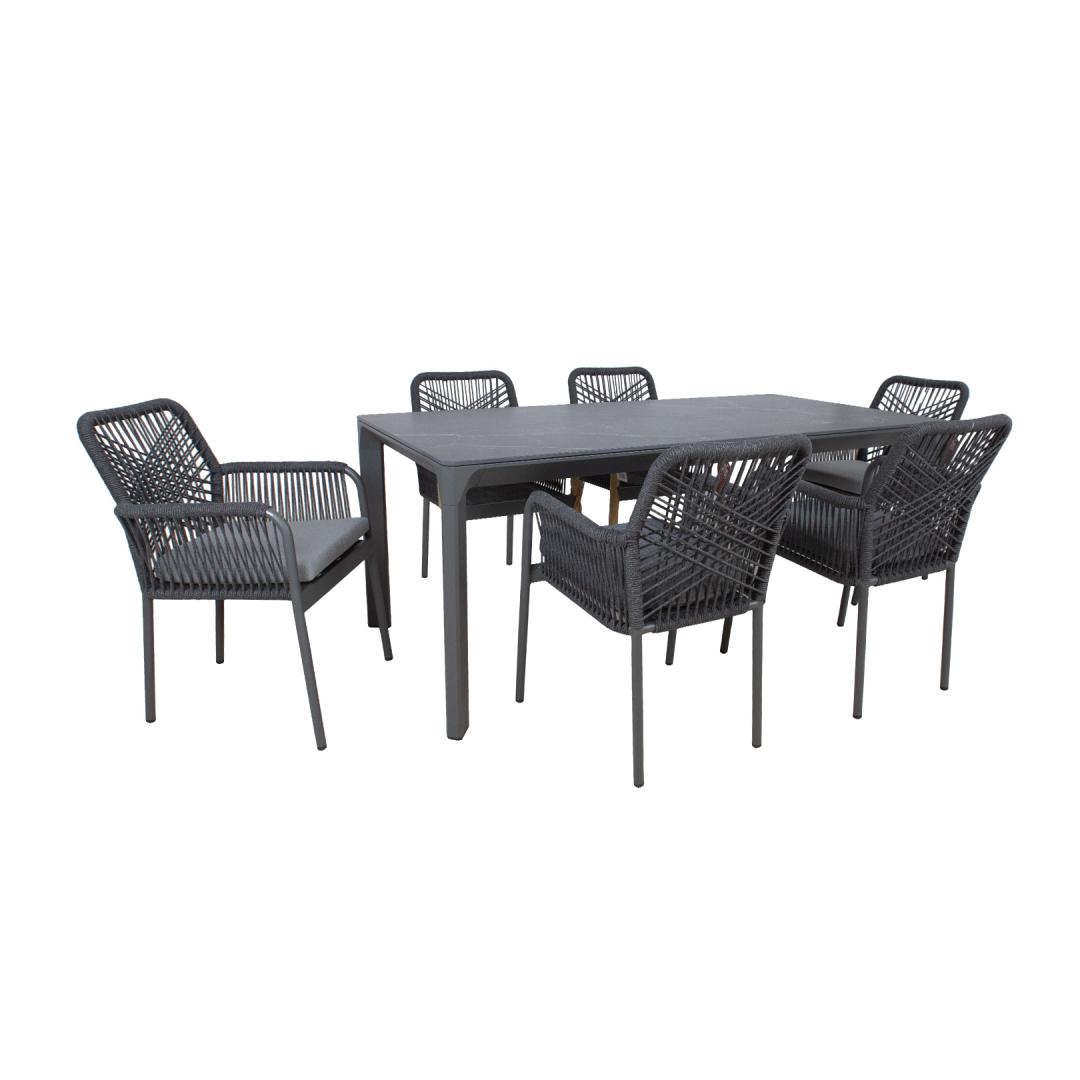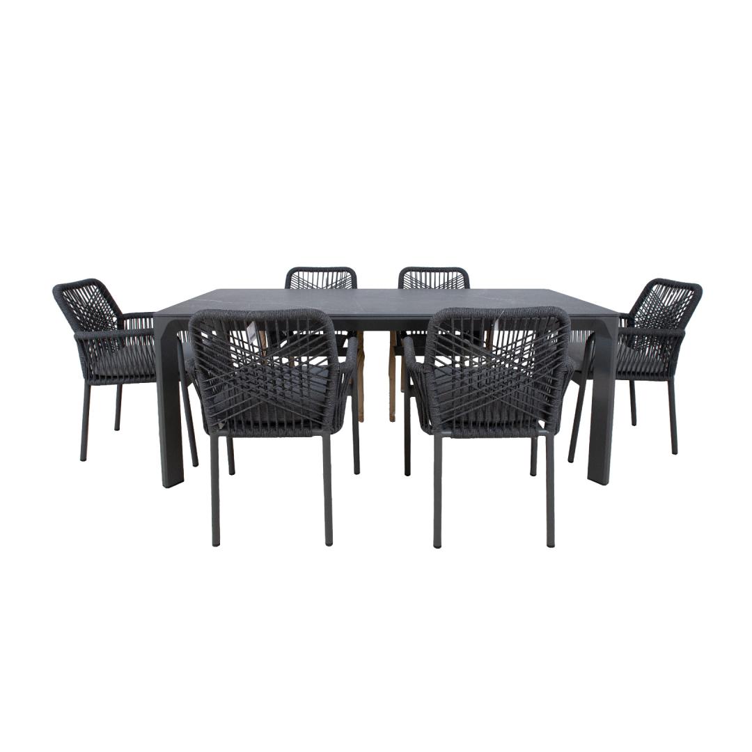 Garden furniture set CARVES table and 6 chairs. The dimensions of the table are 180x90xH75cm, and the thickness of the tabletop is 11mm. The table legs and frame are made of aluminum (48x25x1,2mm) and finished with a grey powder coating. The sintered stone table top is manufactured using recent technological advancements which mimic the process of natural rock formation deep inside the earth's crust. Particles of kaolin (porcelain clay) are processed at 1200 degrees, resulting in a material that resembles natural stone in its properties and appearance. The table top is thin, but very strong (relative hardness on a Mohs scale of 7), durable, withstands high temperatures and various weather conditions, does not absorb stains, and is very easy to clean and maintain. As no chemical binders have been used, the material is hygienic. ATTENTION! Avoid collision, shocks, and falls. The chair frame is made of aluminum and finished with a grey powder coating. The back and armrests of the chair are covered with eye-catching olefin rope weaving. The cushion is included. The cushion cover is made of polyester fabric. Seat cushion thickness 5cm. The seat base is supported with aluminum slats. The dimensions of the chair are 57x60xH89cm, seat height is 44cm. Weight limit 100kg. The chairs are stackable and easy to store and save space. STORAGE: at the end of the summer season, we recommend storing the garden furniture indoors. Clean and dry the furniture before storing it. Use a cool, dry, well-ventilated room for storage. Aiamööblikomplekt CARVES laud ja 6 tooli. Laua mõõdud on 180x90xH75cm, lauaplaadi paksud 11mm. Jalad ja raam on valmistatud alumiiniumist (48x25x1,2mm) ja viimistletud halli pulbervärviga. Paagutatud kivist (sintered stone) lauaplaadi valmistamisel on kasutatud innovatiivset tehnoloogiat, mis jäljendab loodusliku kivi moodustumise protsessi sügaval maakoores. Kaoliini ehk portselansavi osakesed töödeldakse 1200 kraadises kuumuses, mille tulemusena moodustub materjal, mis oma omadustel ja välimuselt sarnaneb naturaalse kiviga. Lauaplaat on küll õhuke, kuid väga tugev (suhteline kõvadus Mohsi skaalal 7), kulumiskindel, talub hästi kõrget temperatuuri ja erinevaid ilmastikutingimusi, ei ima plekke ja seda on väga lihtne puhastada ja hooldada. Kuna keemilisi sideaineid ei ole kasutatud on materjal hügieeniline. TÄHELEPANU! Vältige lööke, põrutusi ja kukkumist. Tooli raam on valmistatud alumiiniumist ja viimistletud halli pulbervärviga. Tooli selja- ja käetoed on kaetud pilkupüüdva olefin nöörist punutisega. Istmepadi kuulub komplekti. Padjakate on valmistatud polüesterkangast. Padja paksus 5cm. Istmepõhi on toestatud alumiiniumliistudega. Tooli mõõdud 57x60xH89cm, istmekõrgus 44cm. Kaalupiirang 100kg. Toolid on virnastatavad ning nende hoiustamine on lihtne ja ruumi säästev. HOIUSTAMINE: suvehooaja lõppedes soovitame aiamööblit hoiustada siseruumides. Puhastage ja kuivatage mööbel enne hoiule panekut. Kasutage hoiustamiseks jahedat, kuiva ning hea ventilatsiooniga.