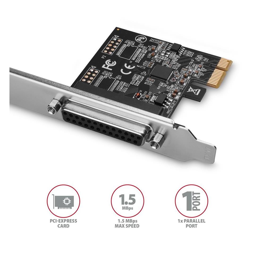 The AXAGON PCEA-P1N PCI-Express card adds one parallel port with a DB25 connector to your desktop PC.