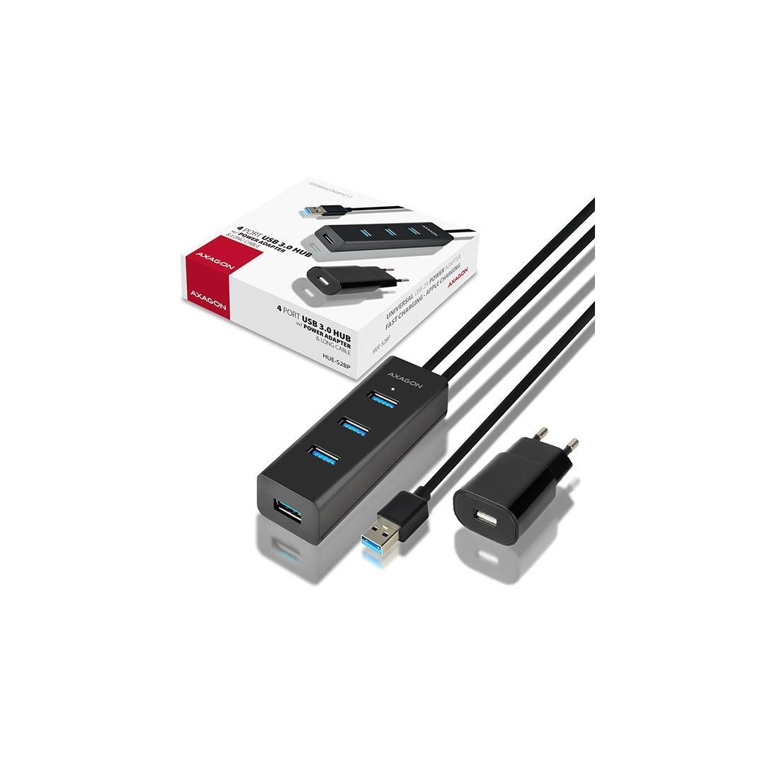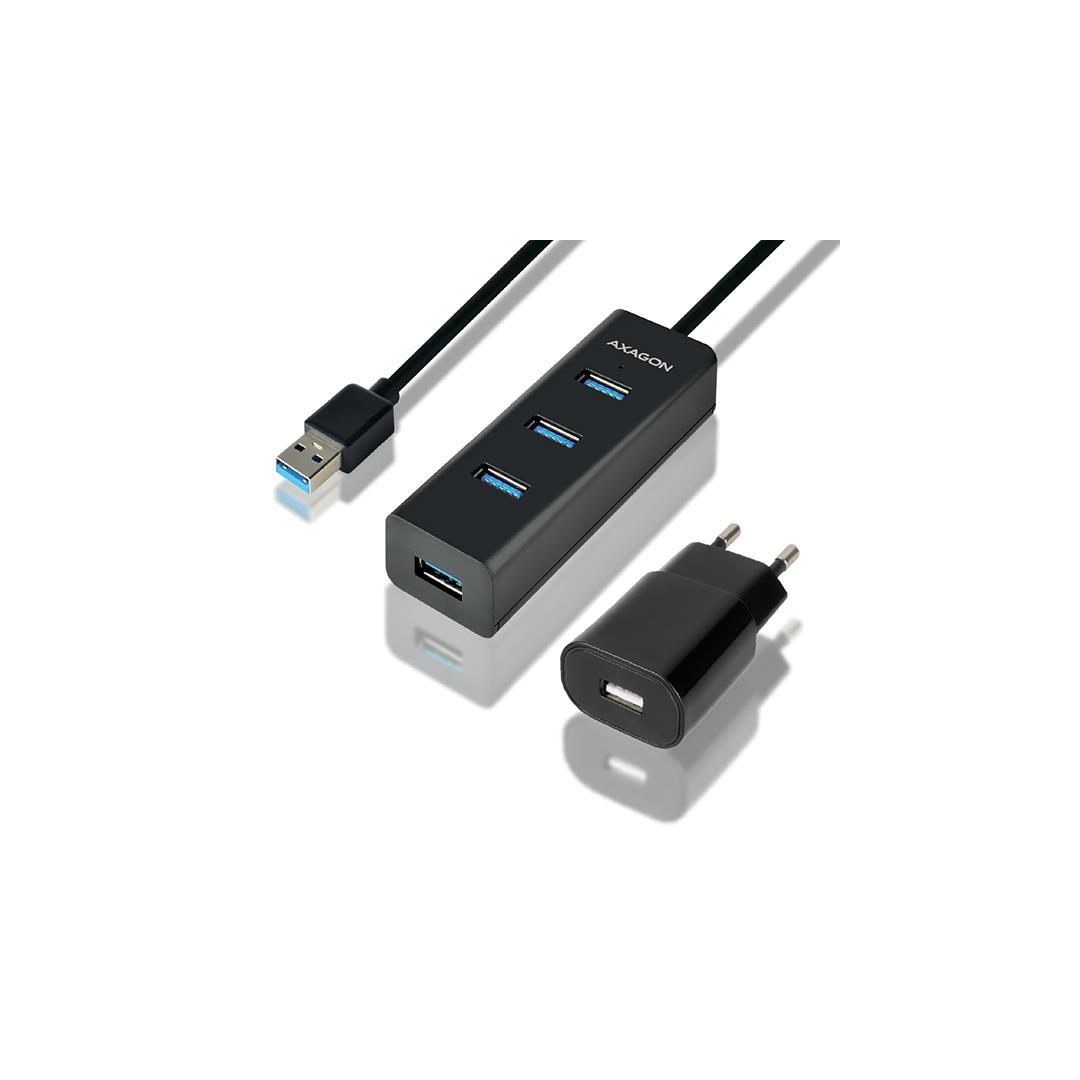 The four port AXAGON HUE-S2BP USB 3.0 hub with a 1.2 m long USB cable, power adapter and fast charging support on all ports.