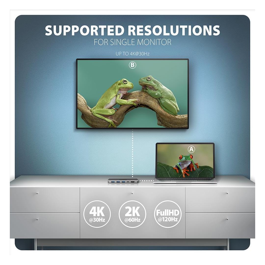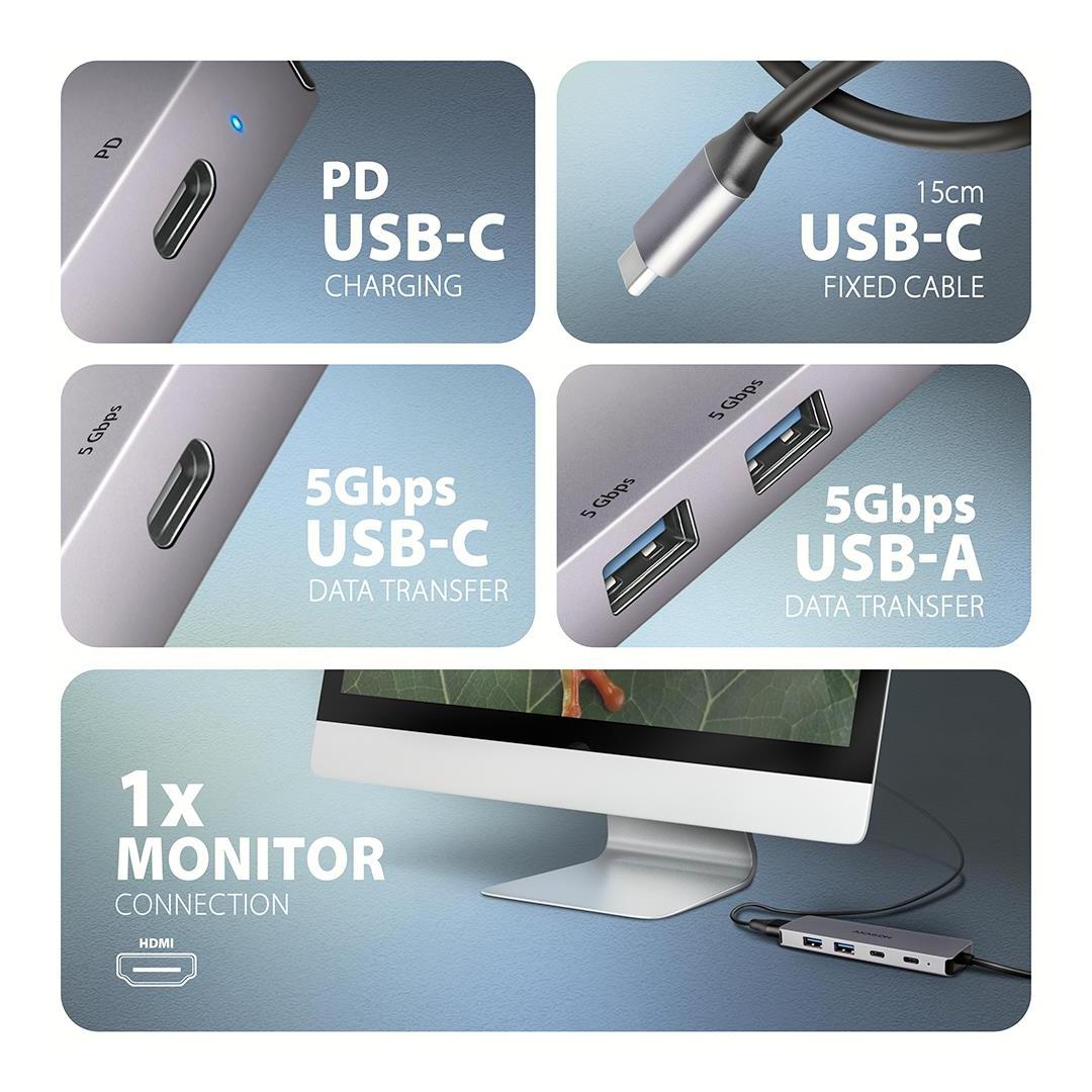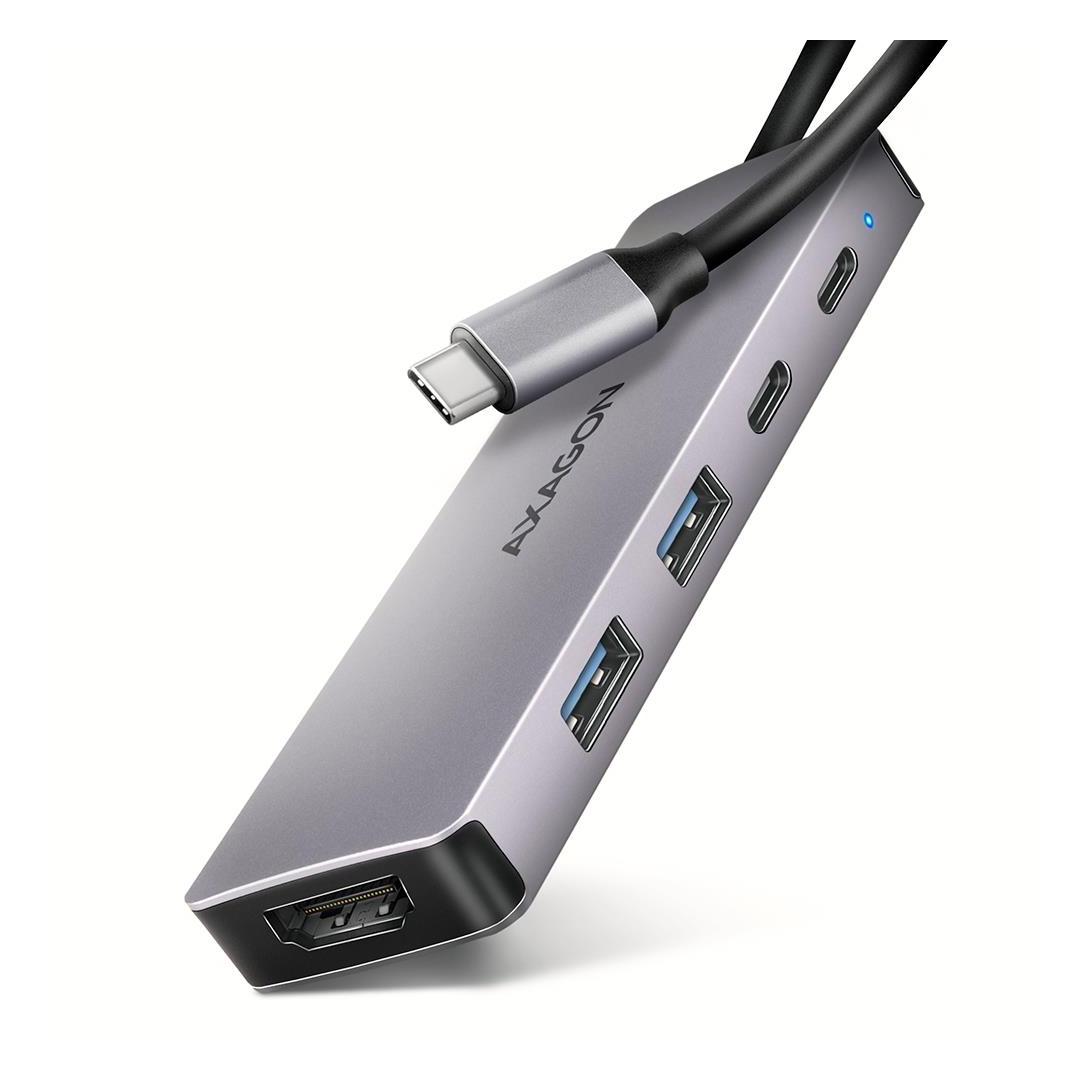 The multi-port USB-C 5Gbps AXAGON HMC-5H60 5in1 hub expands your laptop, computer or phone with five ports. Via the double-sided USB-C connector, you can quickly and easily connect a monitor and three USB devices to the computer at the same time. You also get the possibility to supply laptop using Power Delivery technology at the same time. The port replicator will thus provide you with a simple and compact 5in1 docking station for modern laptops.