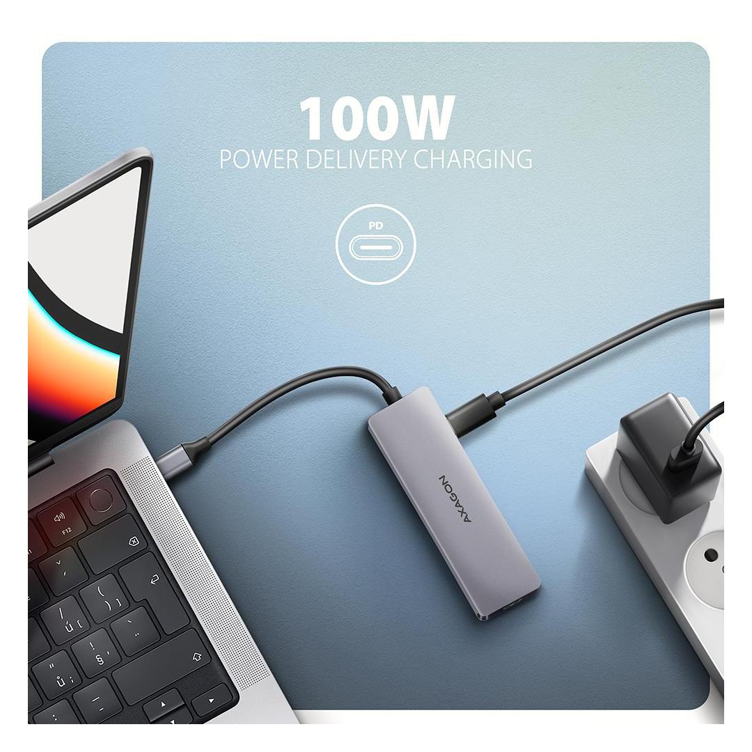 Another USB-C (PD) connector is reserved only for charging phones or laptops using Power Delivery 3.0 technology with up to 100W of power. Connect a suitable USB-C Power Delivery charger into the hub and connect the hub to a laptop that supports Power Delivery. This saves one USB-C port.
