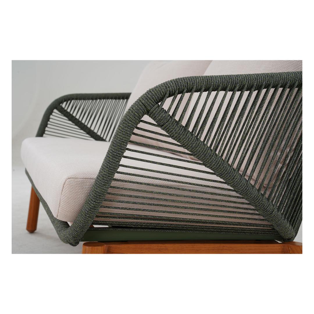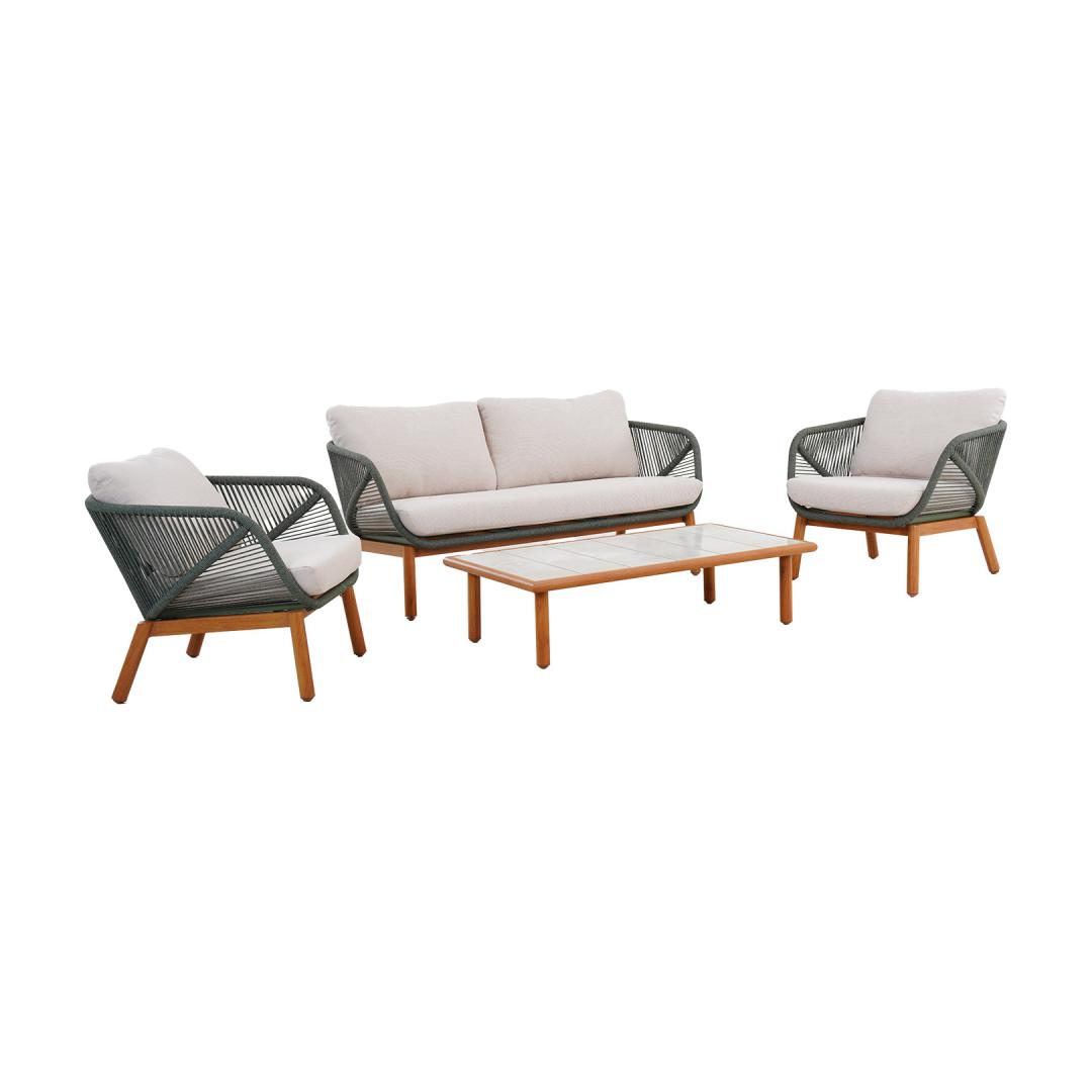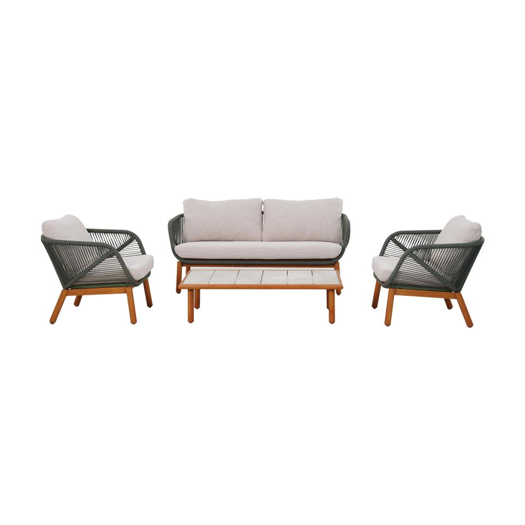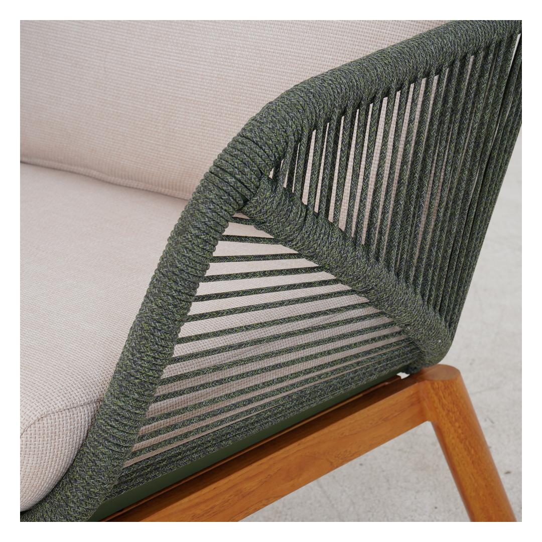 The backrests of the sofa and chairs are decorated with green rope weaving.