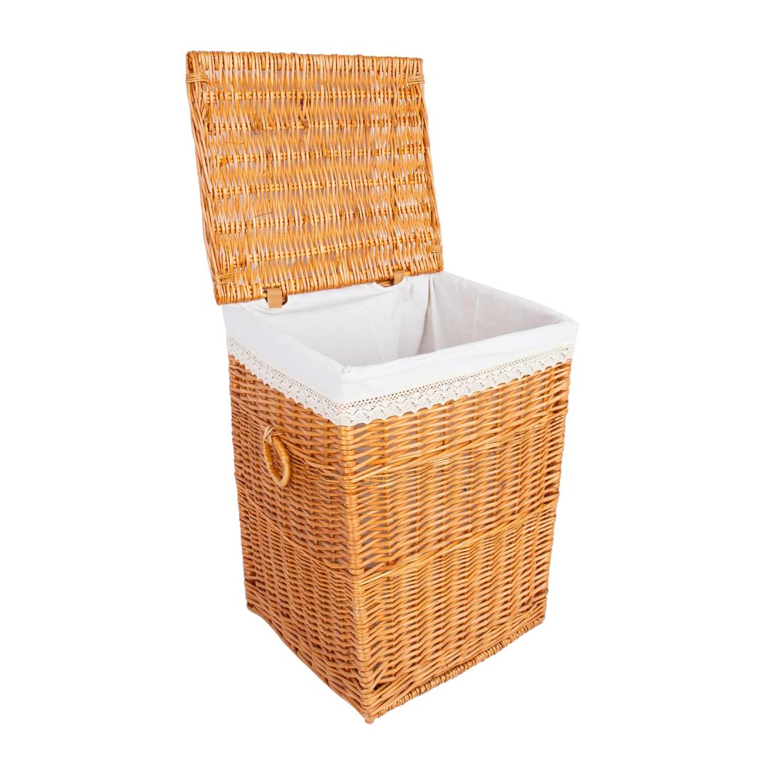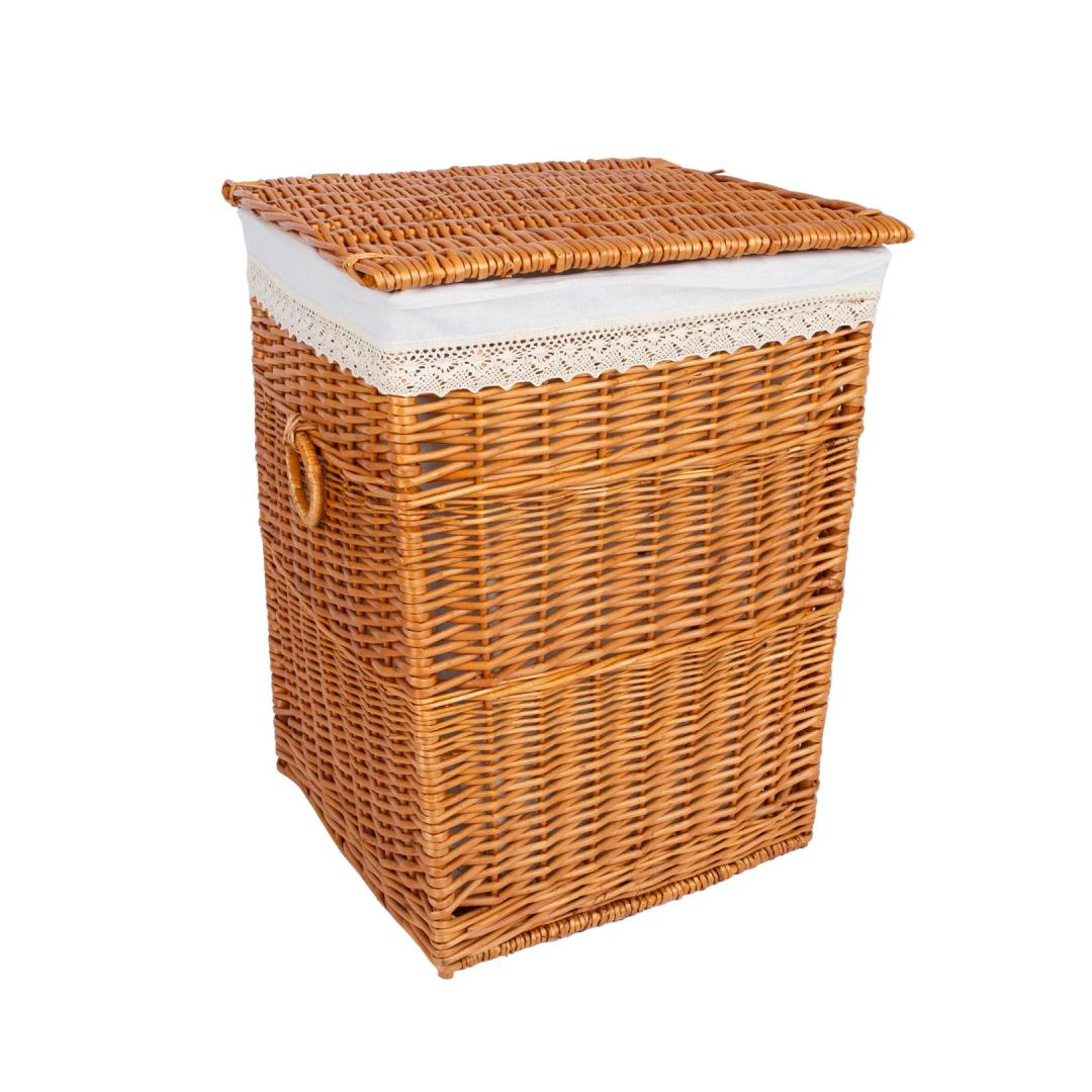 Basket MAX-1, 44x39xH59cm, weave, color: light brown, fabric with lace. Basket material: stained full willow, fabric: canvas with lace. Pesukorv MAX-1, 44x39xH59cm, pruun, pits. Korvi materjal: naturaalne korvipaju, lakitud. Tekstiilvooder: puuvillane pitsiga.