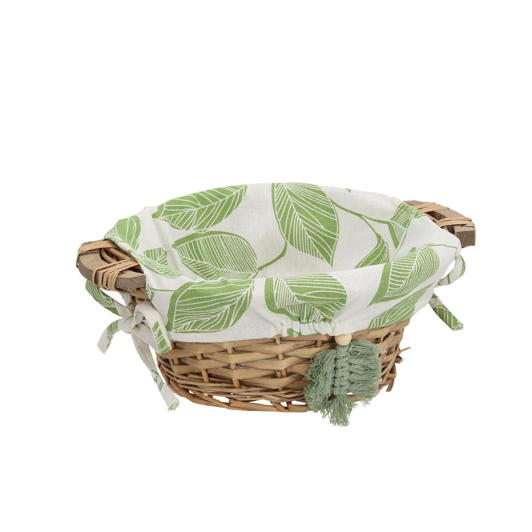 Textile lining: cotton fabric with green leaves pattern. Korvi materjal: käsitsi punutud naturaalne pajuvits.