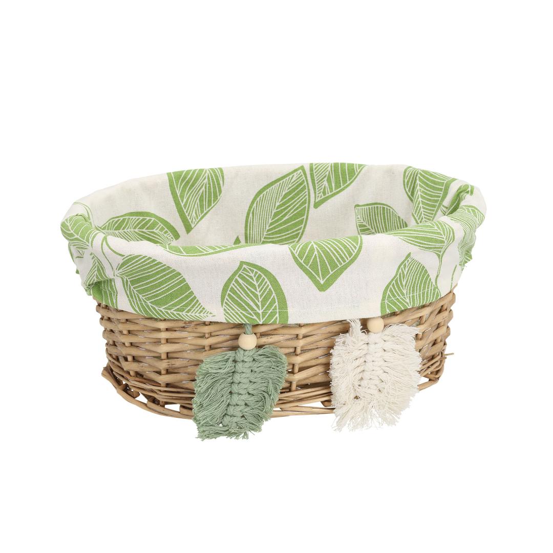 Textile lining: cotton fabric with green leaves pattern. Korvi materjal: käsitsi punutud naturaalne pajuvits.