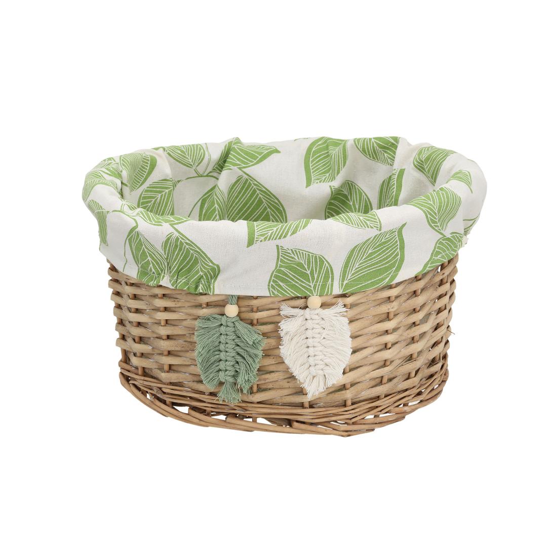 Textile lining: cotton fabric with green leaves pattern. Korvi materjal: käsitsi punutud naturaalne pajuvits.