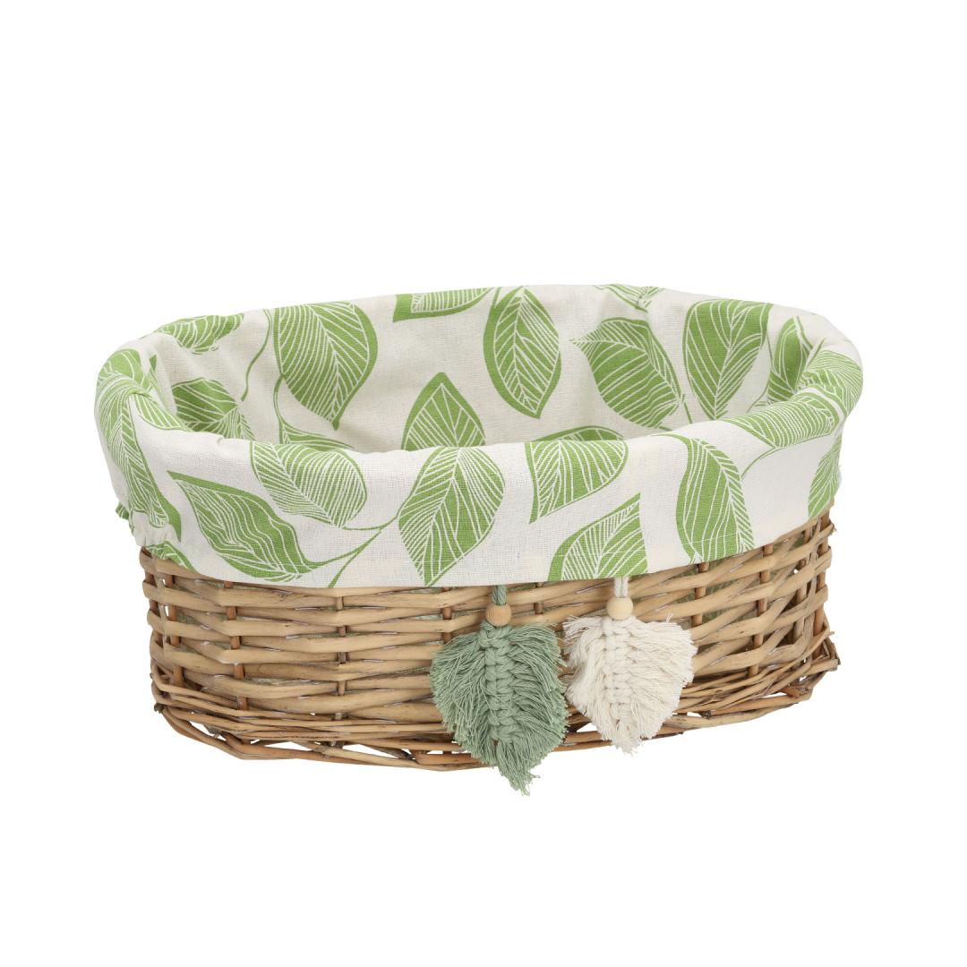 Textile lining: cotton fabric with green leaves pattern. Korvi materjal: käsitsi punutud naturaalne pajuvits.