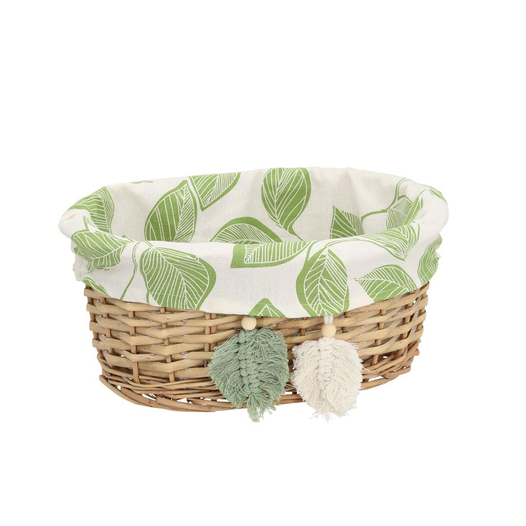 Textile lining: cotton fabric with green leaves pattern. Korvi materjal: käsitsi punutud naturaalne pajuvits.