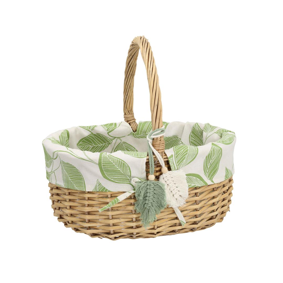 Textile lining: cotton fabric with green leaves pattern. Korvi materjal: käsitsi punutud naturaalne pajuvits.