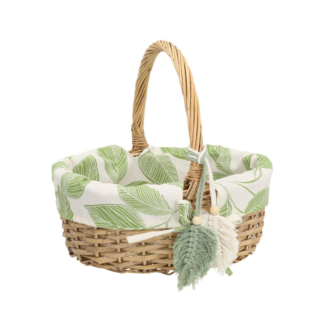 Textile lining: cotton fabric with green leaves pattern. Korvi materjal: käsitsi punutud naturaalne pajuvits.