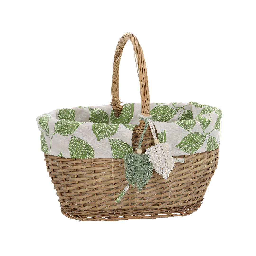 Textile lining: cotton fabric with green leaves pattern. Korvi materjal: käsitsi punutud naturaalne pajuvits.