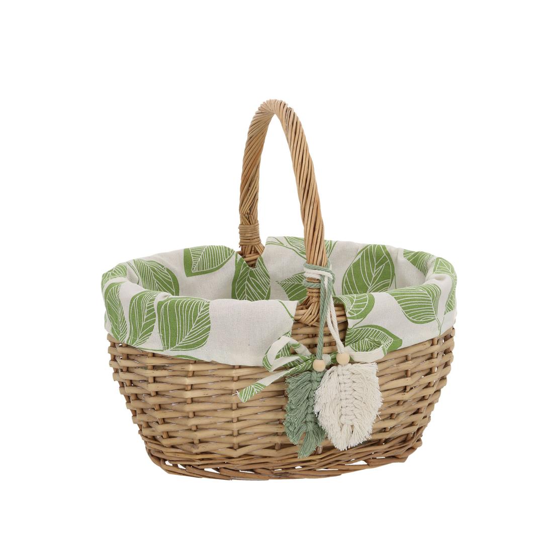 Textile lining: cotton fabric with green leaves pattern. Korvi materjal: käsitsi punutud naturaalne pajuvits.