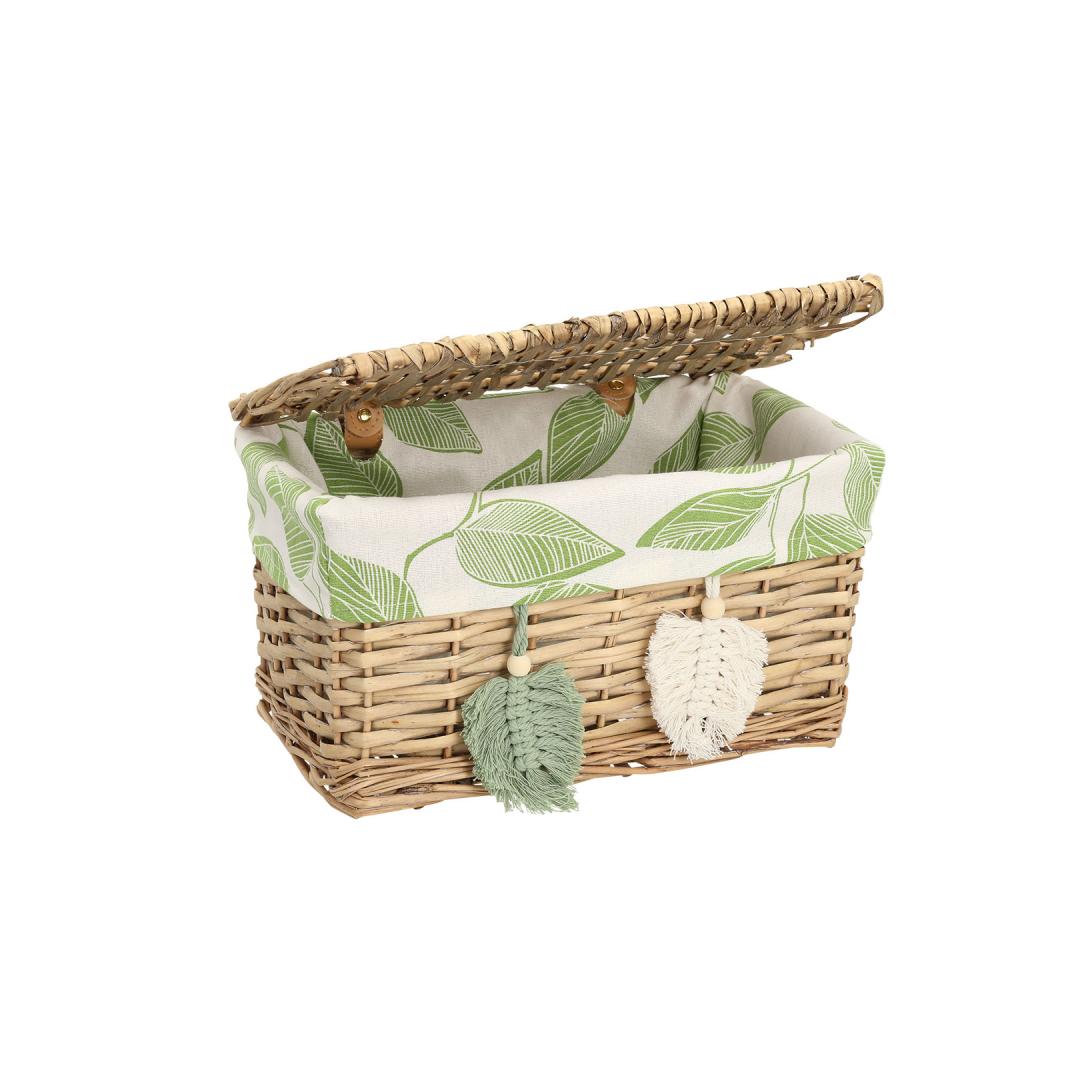 Textile lining: cotton fabric with green leaves pattern. Korvi materjal: käsitsi punutud naturaalne pajuvits.