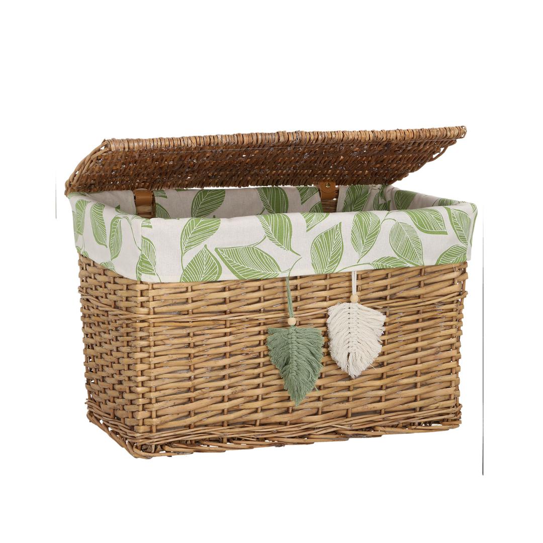 Textile lining: cotton fabric with green leaves pattern. Korvi materjal: käsitsi punutud naturaalne pajuvits.