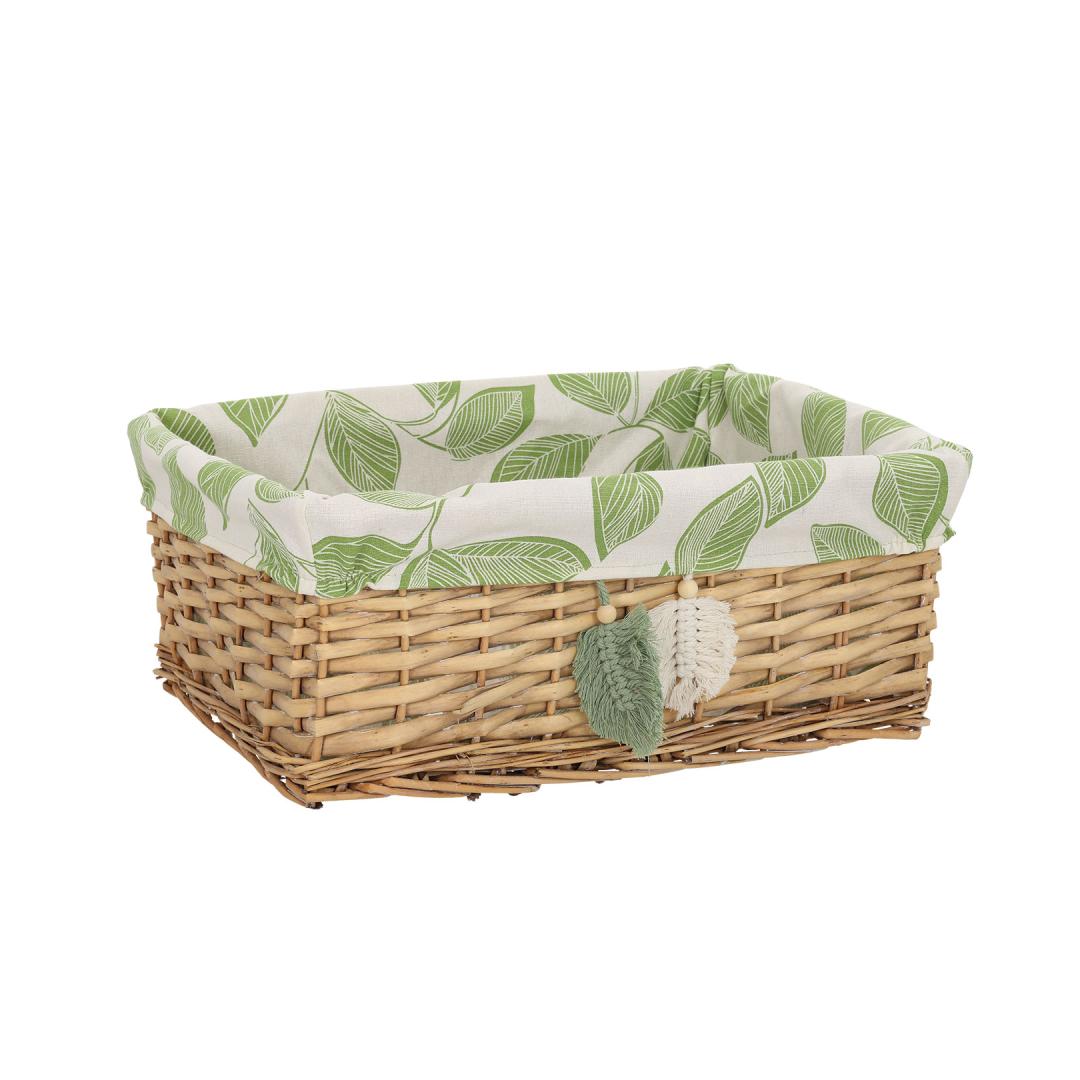 Textile lining: cotton fabric with green leaves pattern. Korvi materjal: käsitsi punutud naturaalne pajuvits.