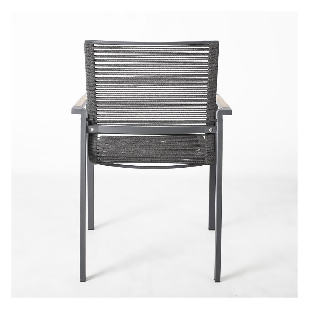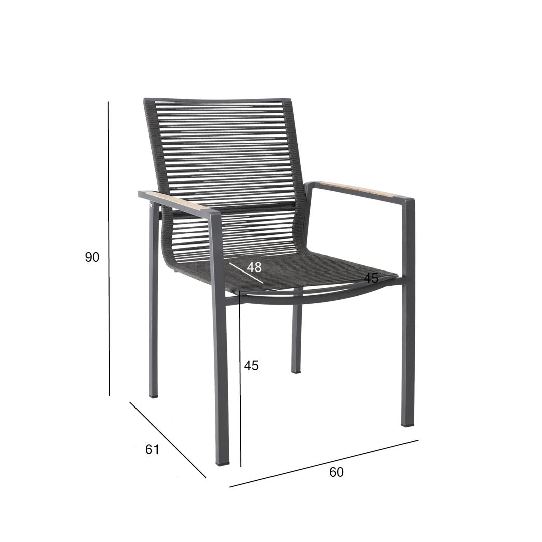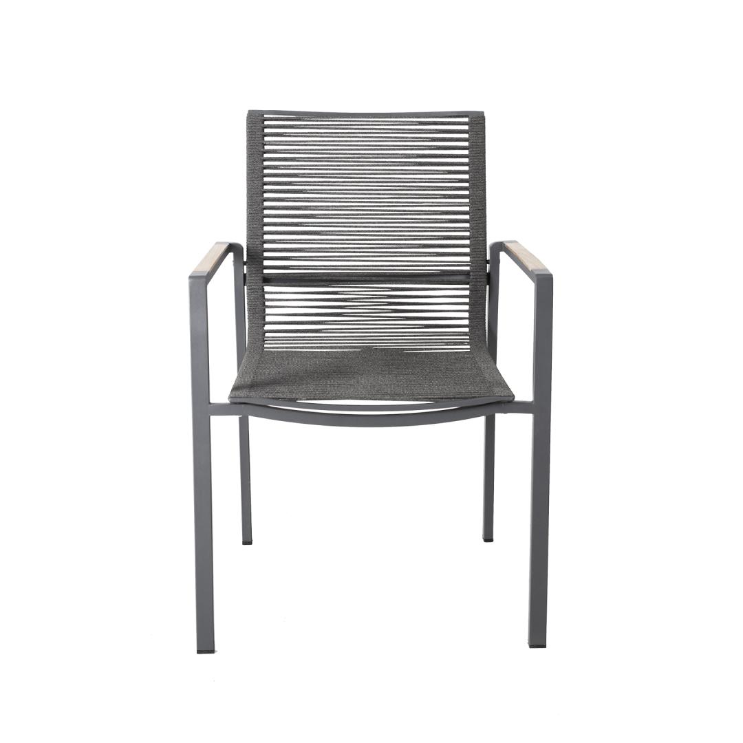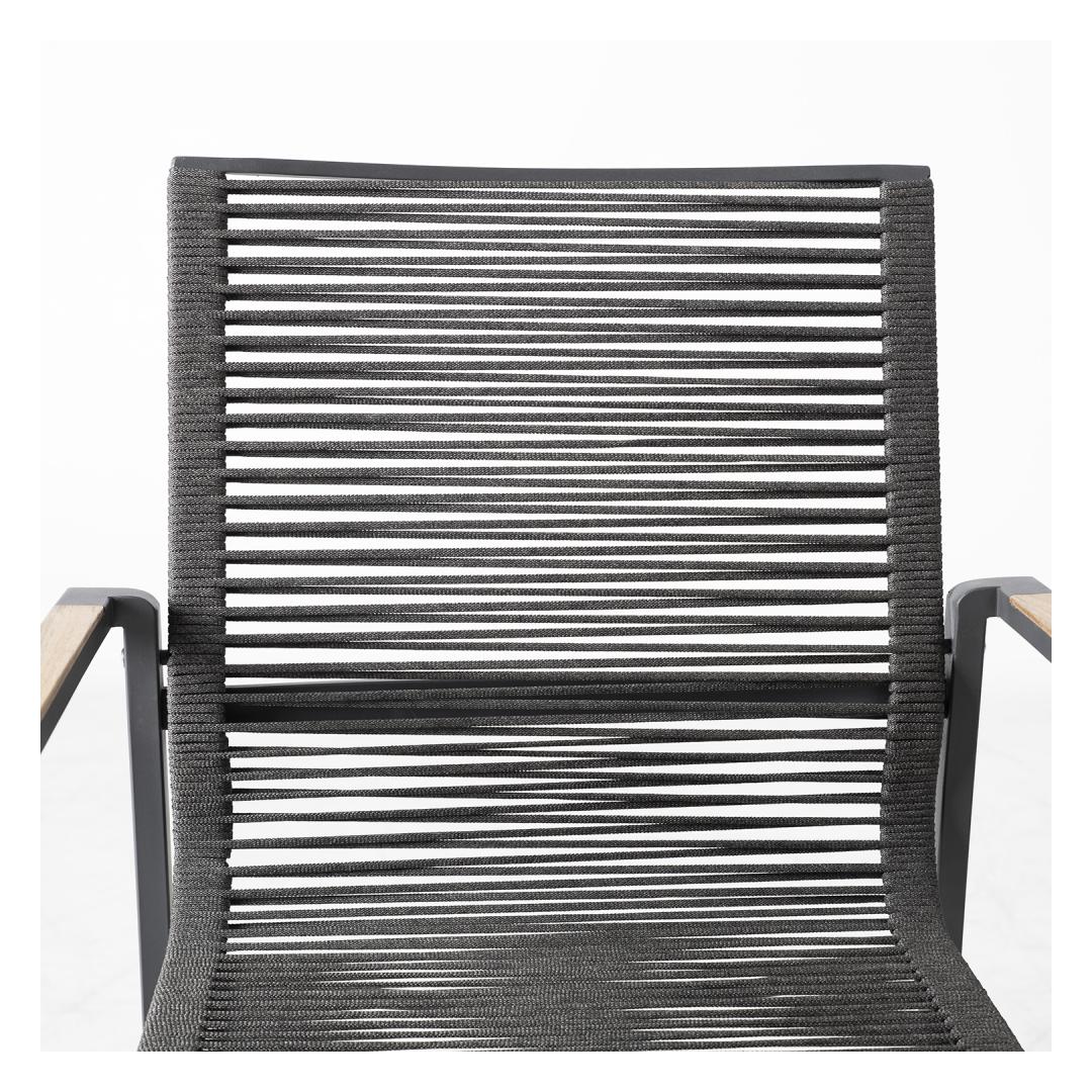 The seat and backrest are covered with rope weaving. The armrests are decorated with natural teak slats.