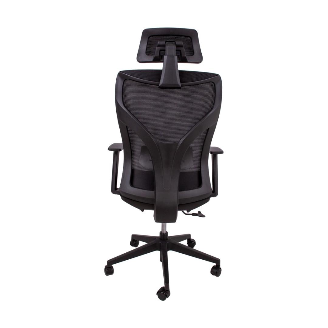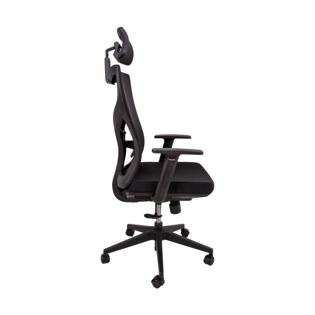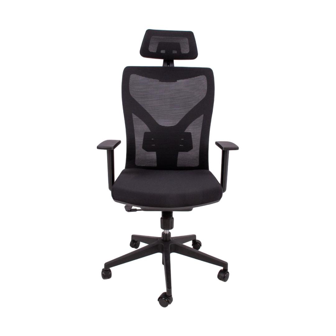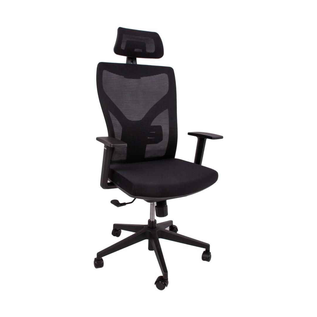 VENON black task chair. The seat is covered with black polyester fabric, 50,000 Martindale. The back and headrest are covered with polyester mesh fabric, 30,000 Martindale. The chair has a rocking mechanism, the backrest angle is lockable in one position. Adjustable lumbar support. The seat height is adjustable using a gas spring. The plastic body and backrest frame are black. The armrests are fixed. The headrest height and angle are adjustable. The 5-star base is made of black plastic, R34cm. The chair has plastic wheels, 50mm. The chair height is 94-100.5cm, seat width 49cm, depth 48cm, seat height 45-54cm. The product dimensions are 58x58xH94-100.5cm. The chair´s weight limit is 120kg.