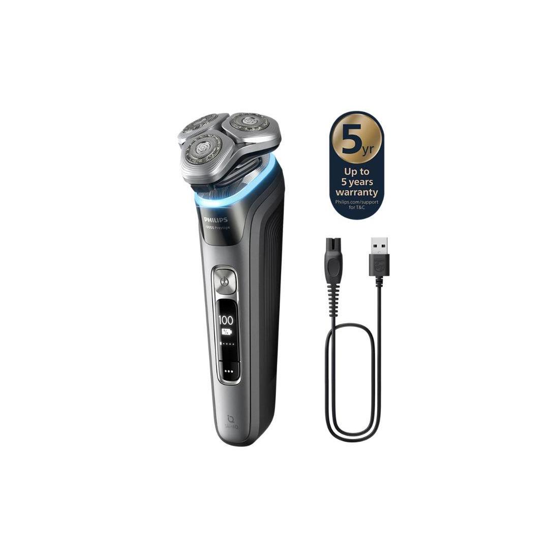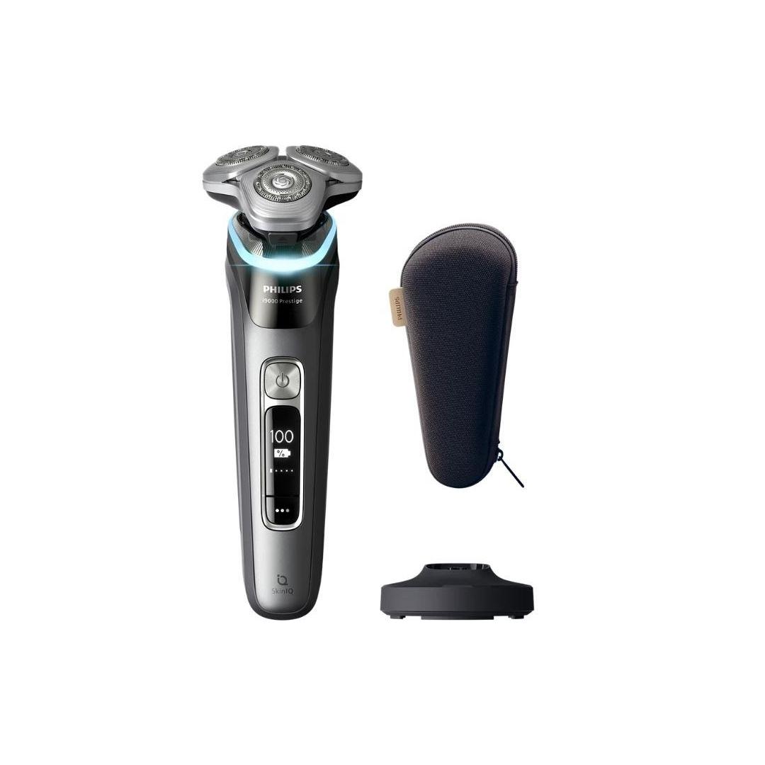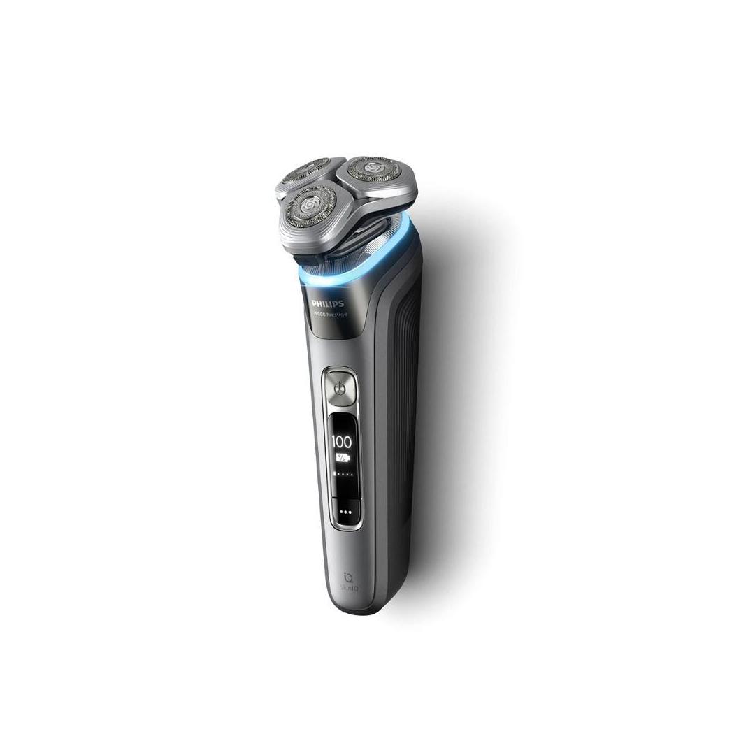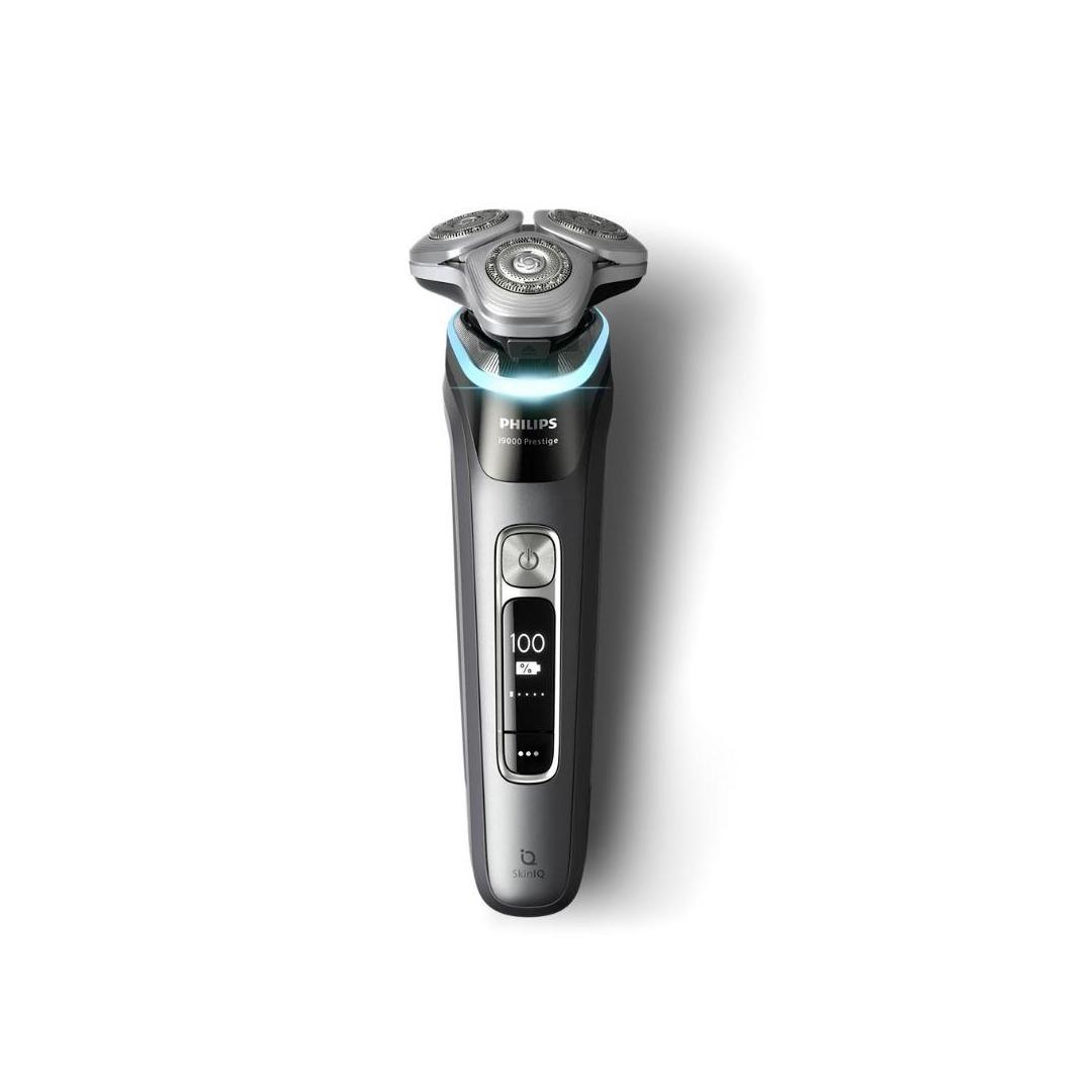 The Philips i9000 Prestige with its triple action Lift&Cut shaving system and compact 360° Precision tilting head cuts hairs at skin level, even in hard-to-reach areas. SkinIQ technology with artificial intelligence senses, guides and adapts to intelligently care for skin comfort.