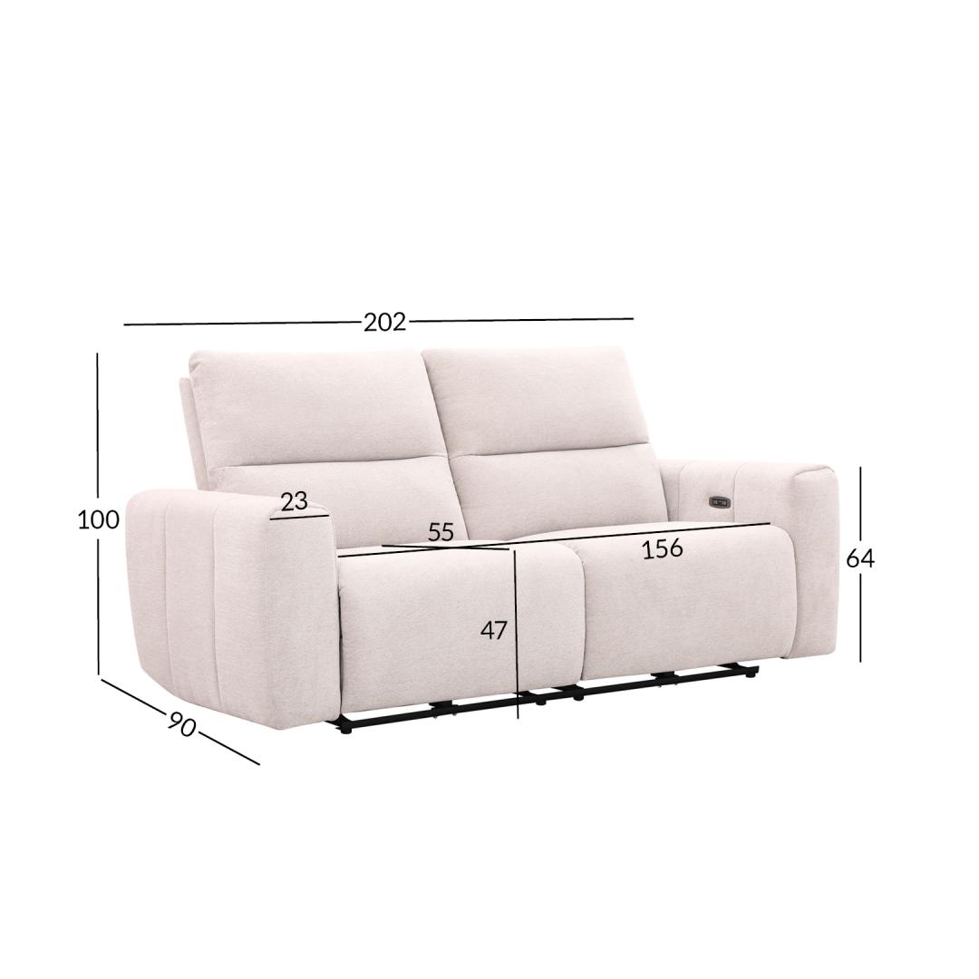The overall dimensions of the sofa are 202x90xH100cm. Seat width 156cm, seat depth 55cm, seat height 47cm. Armrest height from the ground 64cm, armrest width 23cm. Diivan MATIAS 3-kohaline elektriline recliner, helehelebeež.