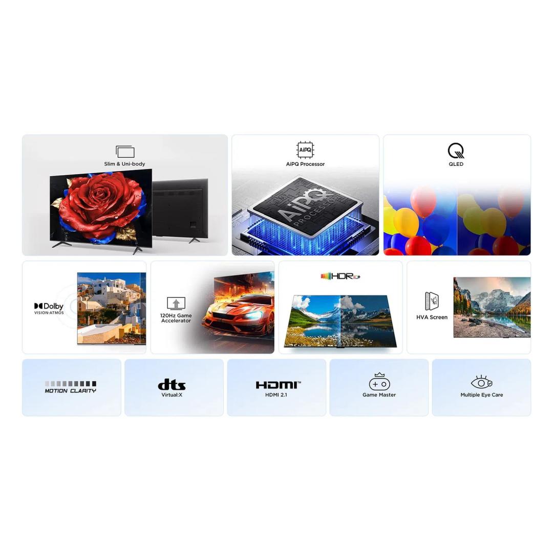 TCL T69C 43T69C. Display diagonal: 109.2 cm (43"), Display resolution: 3840 x 2160 pixels, HD type: 4K Ultra HD, Display technology: QLED, Screen shape: Flat, LED backlighting type: Direct-LED. Smart TV. Display brightness: 350 cd/m², Native aspect ratio: 16:9. Wi-Fi. Product colour: Metallic