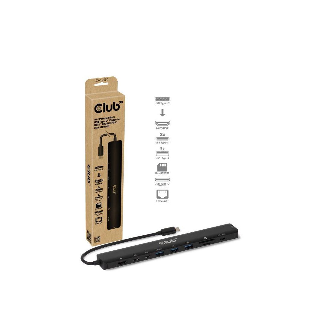 The Club 3D CSV-2550 is a 10-1 Portable Dock USB Type-C® 10Gbps to HDMI™ 8K30Hz PD3.1 Max.140Watt, providing an ideal solution for extending the port of USB Type-C® or Thunderbolt® host (PC/Laptop/Mobile phone, etc.), especially for those host with a single USB Type-C® port. This hub enables to output HDMI™ with max 8K30Hz or 4K144Hz high refresh rate for more natural and smoother visual experience at the meanwhile transfer USB 10Gbps data. 3x USB Type-A and 2x USB Type-C® data ports allow you to connect 5 USB devices simultaneously. SD/Micro SD allow to insert 2 card slots simultaneously for data transmission or for reading/writing information on the host. RJ45 port allows the host to get access to 2.5 Gigabit Ethernet. Besides, the USB Type-C® female supports PD 3.1 with max 140W PD Charging. It can work on all DP Alt mode supported USB Type-C® hosts.