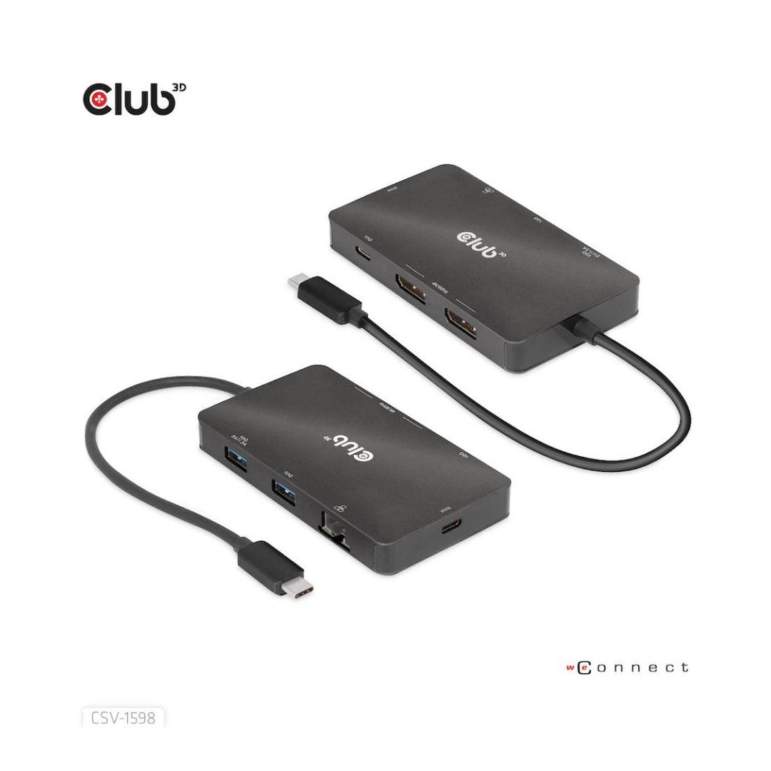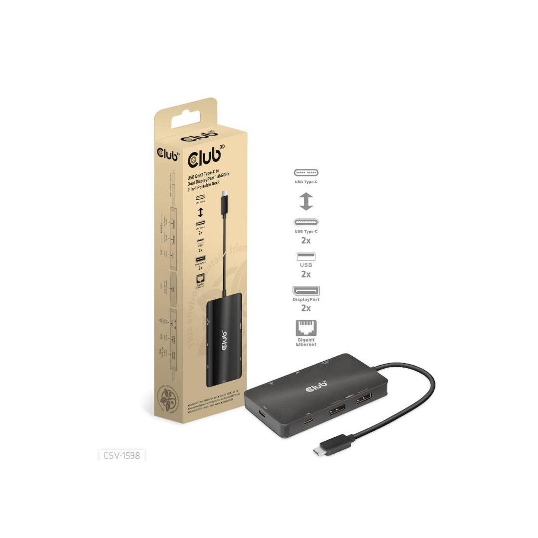 The Club 3D CSV-1598 is a 7-in-1 USB Gen2 Type-C to Dual Display Portable Dock with DP™1.4 Alt mode which provides most advanced, efficient solution to extend a single USB Type-C port to be multiple ports. It integrates video, data and power ports that allows to connect 2 DisplayPort™ 4k60Hz displays simultaneously for enjoying videos on big screen, connect multiple USB devices for data transmission , connect Ethernet source for getting PC to super high speed network. Besides, it has PD charging port which supports max 100W PD charging to support the function of the adapter and charge for the host simultaneously.It can work on all DP™ Alt mode supported USB Type-C host.
