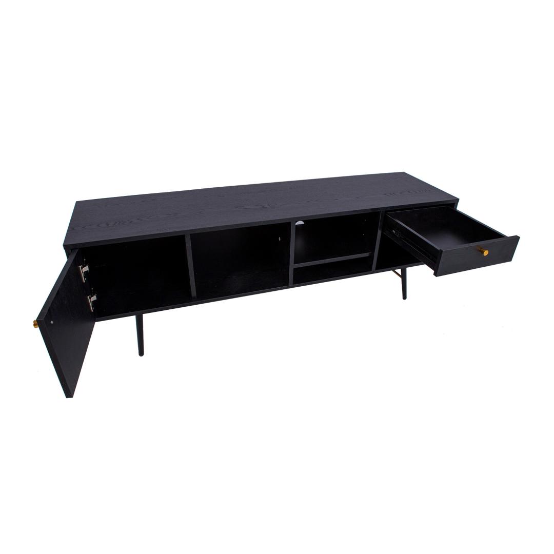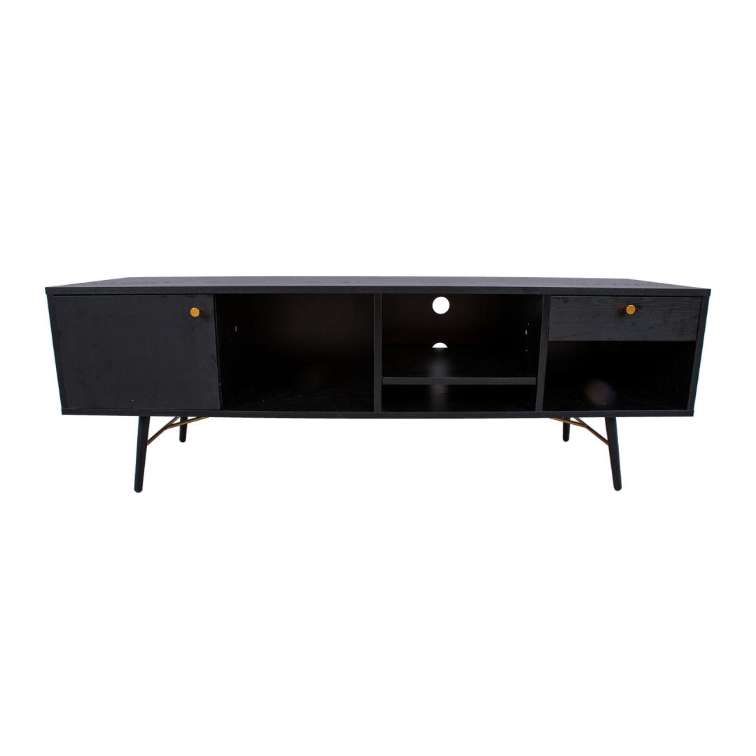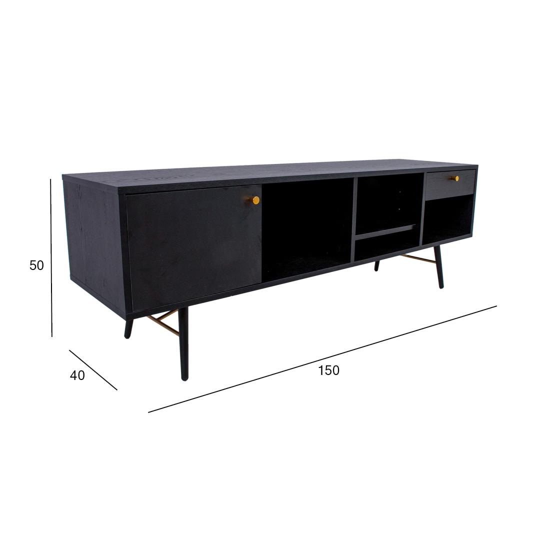 TV table LUXEMBOURG 150x40xH50cm, black melamine. The TV table is made of wood-decorated melamine-coated furniture board. The table legs are connected by copper-colored metal details, which give the table a stylish look and at the same time ensure the strength of the base structure. The TV table has one cabinet with a door, one drawer and 4 open shelves of different sizes. Door hinges and drawer rails close quietly. Drawer and door knobs are made of copper-colored aluminum. The height of the table legs is 20 cm.