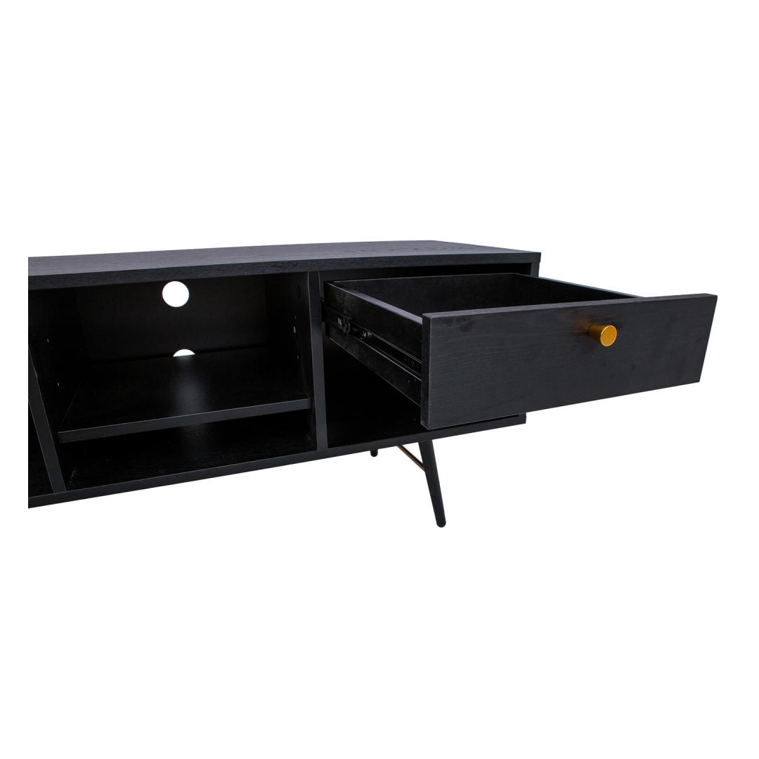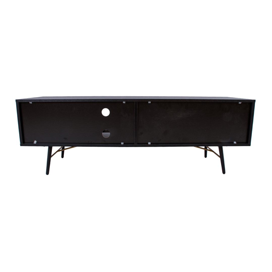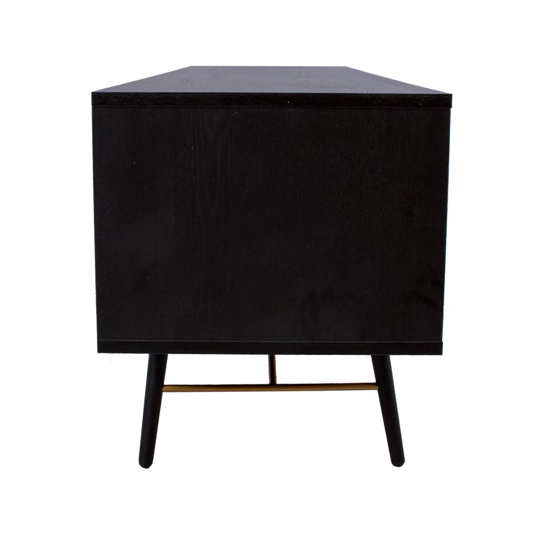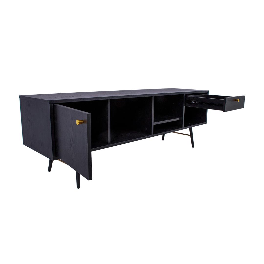 TV table LUXEMBOURG 150x40xH50cm, black melamine. The TV table is made of wood-decorated melamine-coated furniture board. The table legs are connected by copper-colored metal details, which give the table a stylish look and at the same time ensure the strength of the base structure. The TV table has one cabinet with a door, one drawer and 4 open shelves of different sizes. Door hinges and drawer rails close quietly. Drawer and door knobs are made of copper-colored aluminum. The height of the table legs is 20 cm.