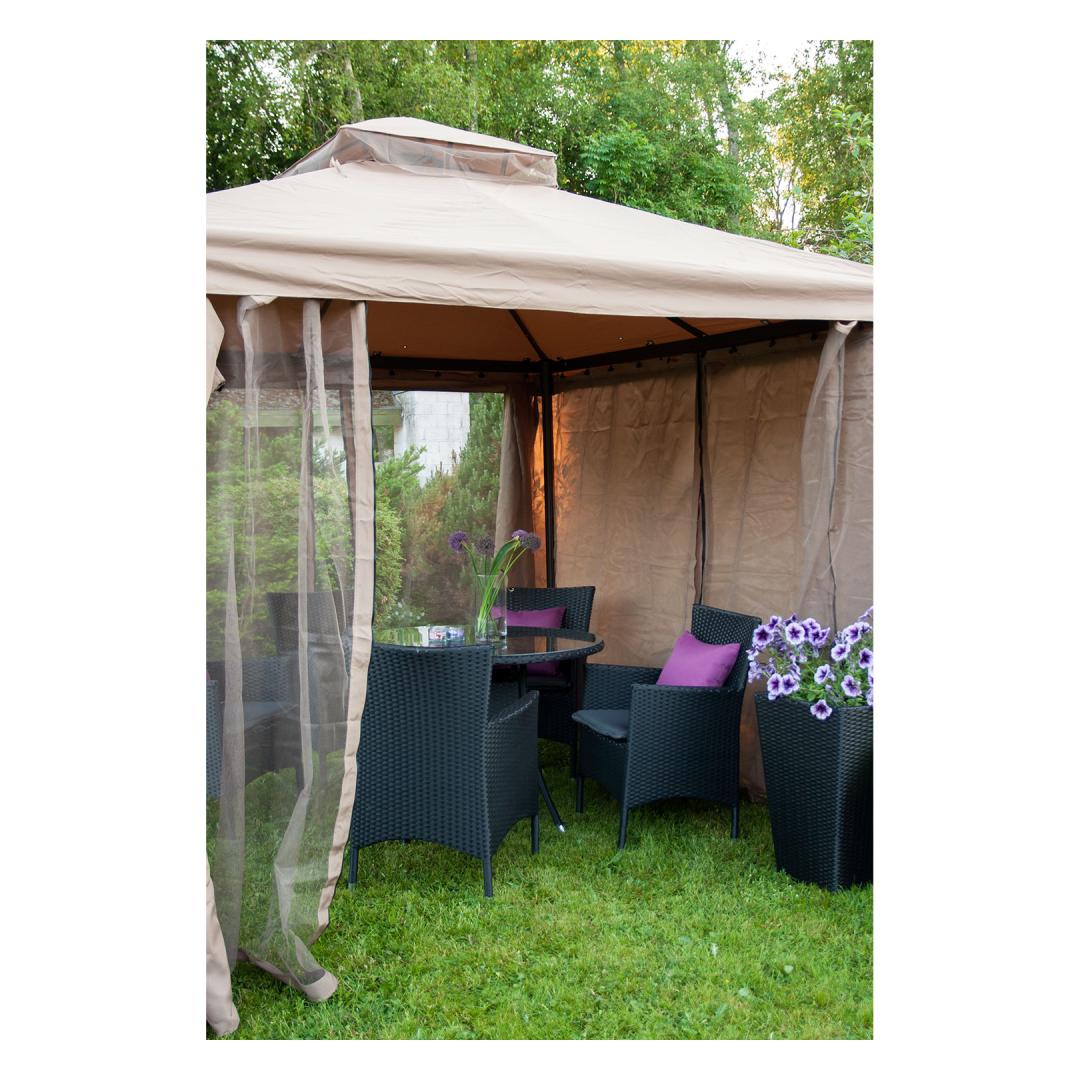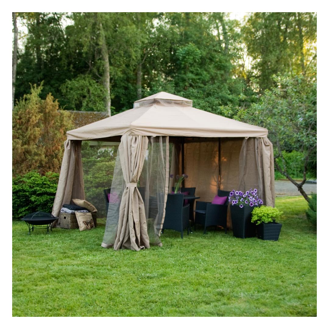 Awning LEGEND 2.91x3.91xH2/2.8m, beige. The canopy offers pleasant shade from both hot sun and cool wind and allows you to enjoy being outdoors regardless of the weather and time of day. The strong and stable main structure of the canopy is made of aluminum. The details of the roof support frame are made of steel. All frame details are finished with dark brown powder paint. Side post D60mm, roof beams 16x26mm. The roof is made of PVC coated polyester fabric 250g/m², the side walls are made of polyester fabric 150g/m². Mosquito nets are included with the canopy. Anchor the canopy to the base. WARNING: Designed as a temporary installation, the lightweight canopy is not intended for use in high winds and rain and should not be left unattended to adverse weather conditions. The roof and walls are made of materials with very good weather resistance, but they are not waterproof. STORAGE: to extend the life of the product, we recommend disassembling it for the winter season and storing it in a dry and well-ventilated room. Clean and dry the roof and side walls before storage.