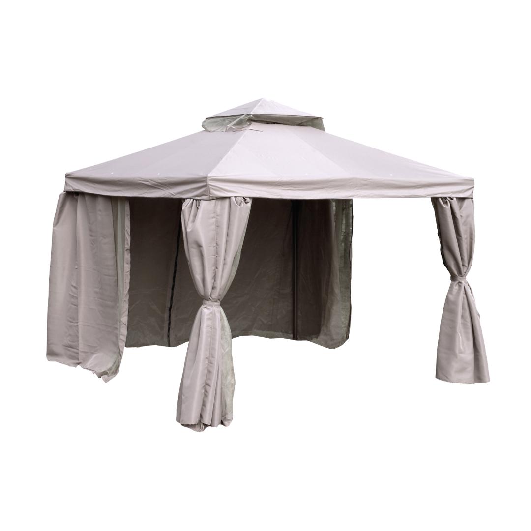 Awning LEGEND 2.91x2.91xH2.8m, beige. The canopy offers pleasant shade from both hot sun and cool wind and allows you to enjoy being outdoors regardless of the weather and time of day. The strong and stable main structure of the canopy is made of aluminum. The details of the roof support frame are made of steel. All frame details are finished with dark brown powder paint. Side post D60mm, roof beams 16x26mm. The roof is made of PVC coated polyester fabric 250g/m², the side walls are made of polyester fabric 150g/m². Mosquito nets are included with the canopy. Anchor the canopy to the base. WARNING: Designed as a temporary installation, the lightweight canopy is not intended for use in high winds and rain and should not be left unattended to adverse weather conditions. The roof and walls are made of materials with very good weather resistance, but they are not waterproof. STORAGE: to extend the life of the product, we recommend disassembling it for the winter season and storing it in a dry and well-ventilated room. Clean and dry the roof and side walls before storage.