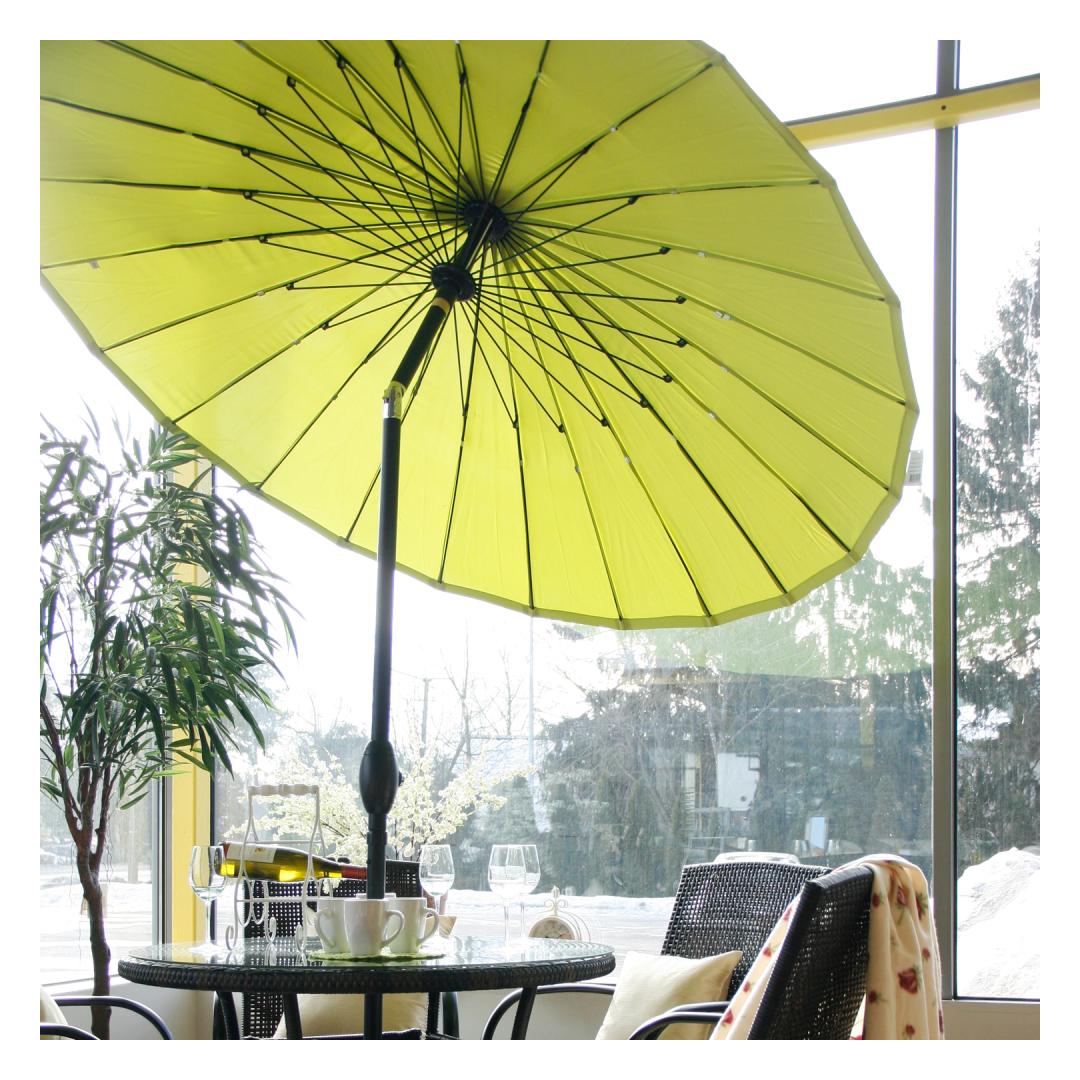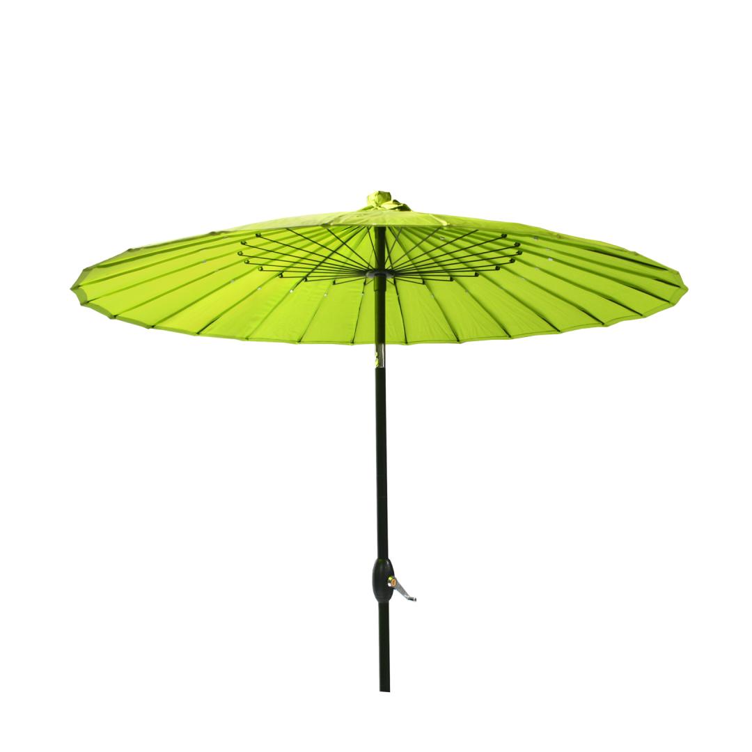 Sunshade SHANGHAI D2,13m, green. The parasol cover is made of green polyester fabric 180g/m². The shade has 24 steel ribs D4.5mm and an aluminum leg D38mm. The leg and ribs are covered with black powder paint. The sunshade can be opened with a crank, the angle of the upper part of the shade can be changed. The sunshade is not included. WARNING: The product is not intended for use in strong wind or rain. Do not leave the open parasol unattended. CARE: Store in a dry, well-ventilated area. Allow the parasol to dry completely before storing it.