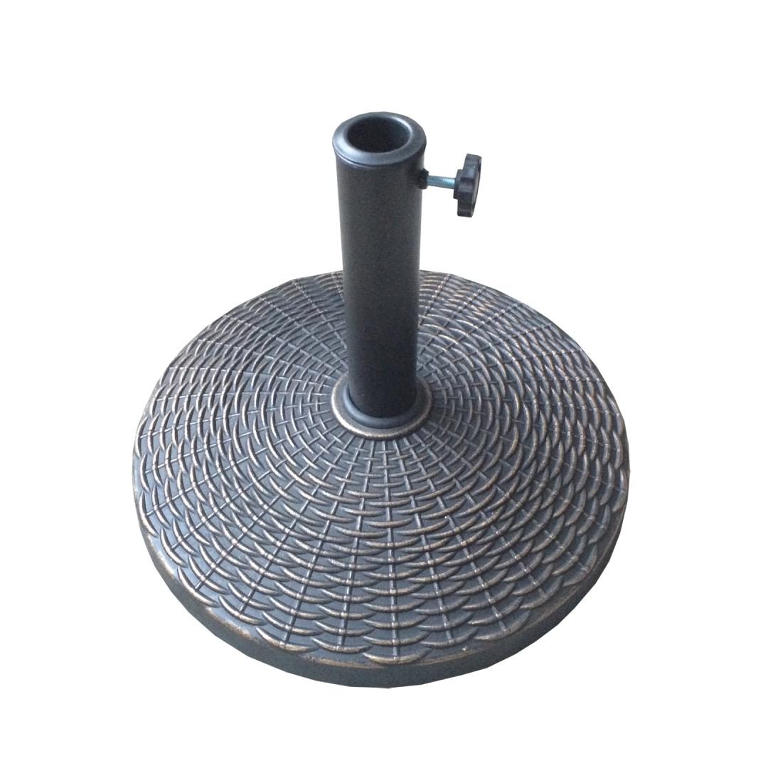 Sunshade D44.5xH33.5cm/10kg, resin. The base is suitable for parasols with a leg diameter of 38-48mm. The base is cast in epoxy resin. The braided surface is painted with a dark metallic color. STORAGE: At the end of the summer season, we recommend storing the parasols indoors. Use a dry and well-ventilated room for storage.