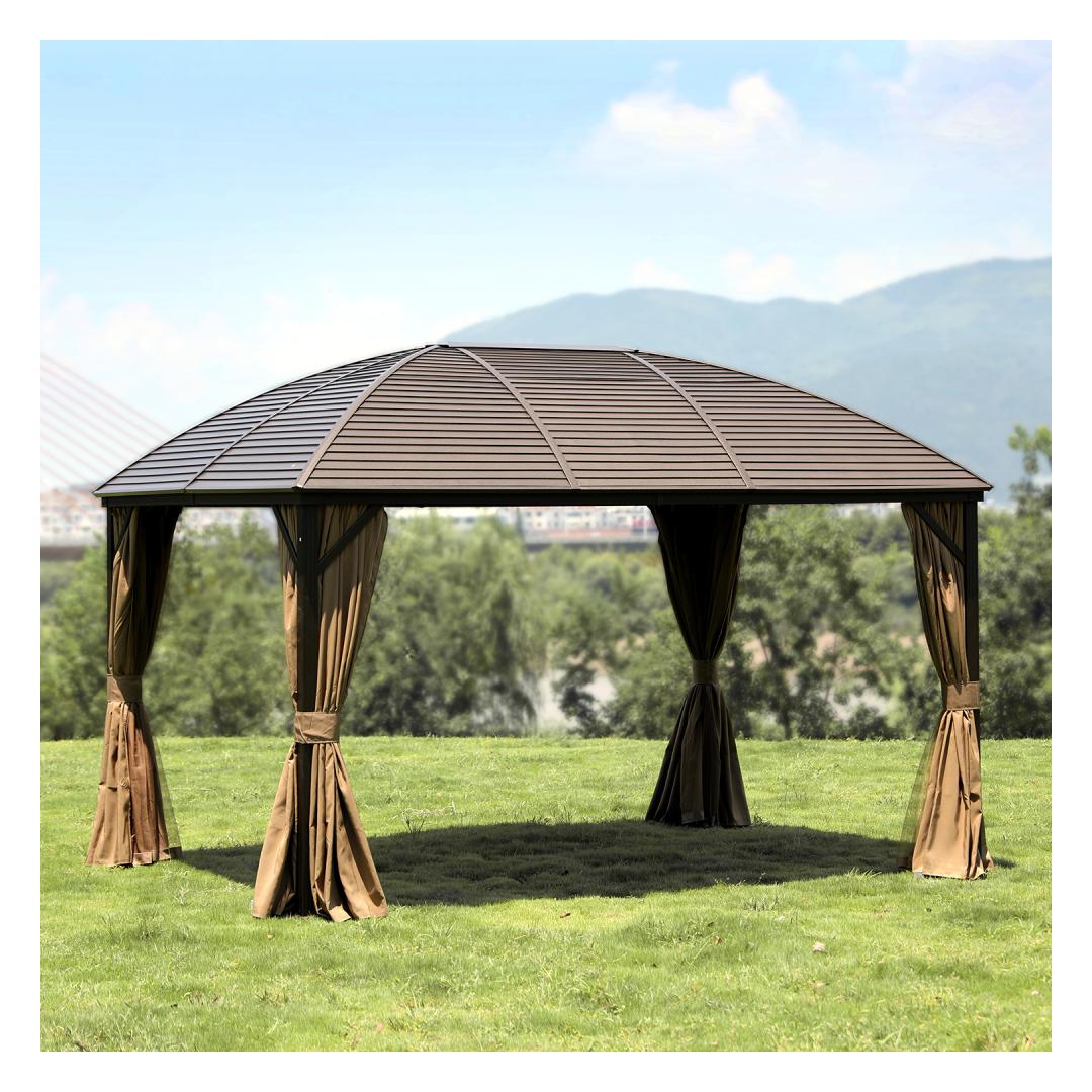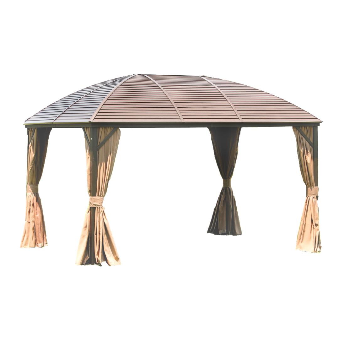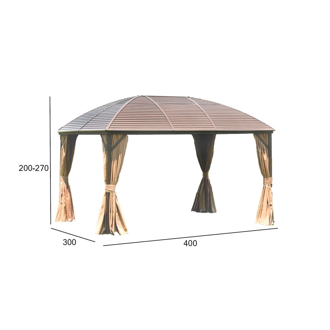 Canopy SUNSET 3x4xH2/2.7m, brown/beige. The elegant and functional canopy/garden pavilion offers protection and shade from both light rain and scorching sun and allows you to enjoy being outdoors regardless of the weather and time of day. On all sides of the canopy there are beige polyester fabric (180g/m²) curtains and zippered nylon mosquito nets. The main structure of the canopy is made of aluminum. All parts of the frame are finished with brown powder paint. The dimensions of the side pillars are 76x76mm, the dimensions of the cross beam are 107x46mm, the roof ribs are 52x40x1mm, 44x31x1mm. The thickness of the galvanized metal roof is 4mm. WARNING: Do not leave the canopy unattended during extreme weather conditions or a storm warning. Strong wind, rain or snow can damage the canopy. STORAGE: to extend the life of the canopy, we recommend disassembling it at the end of the summer season and storing it in a cool, dry and well-ventilated room. If the canopy is left up for the winter, it must be ensured that there is no excessive accumulation of snow on the roof. Remove accumulated snow as soon as possible. At the end of the summer season, remove mosquito nets and curtains. Clean and dry curtains before storing.