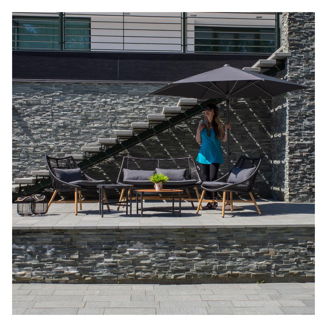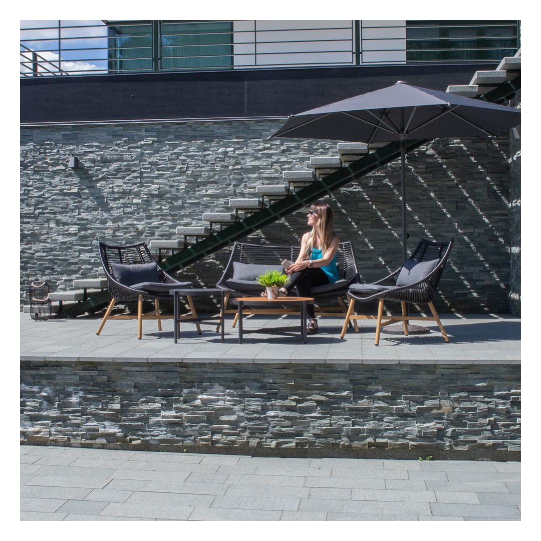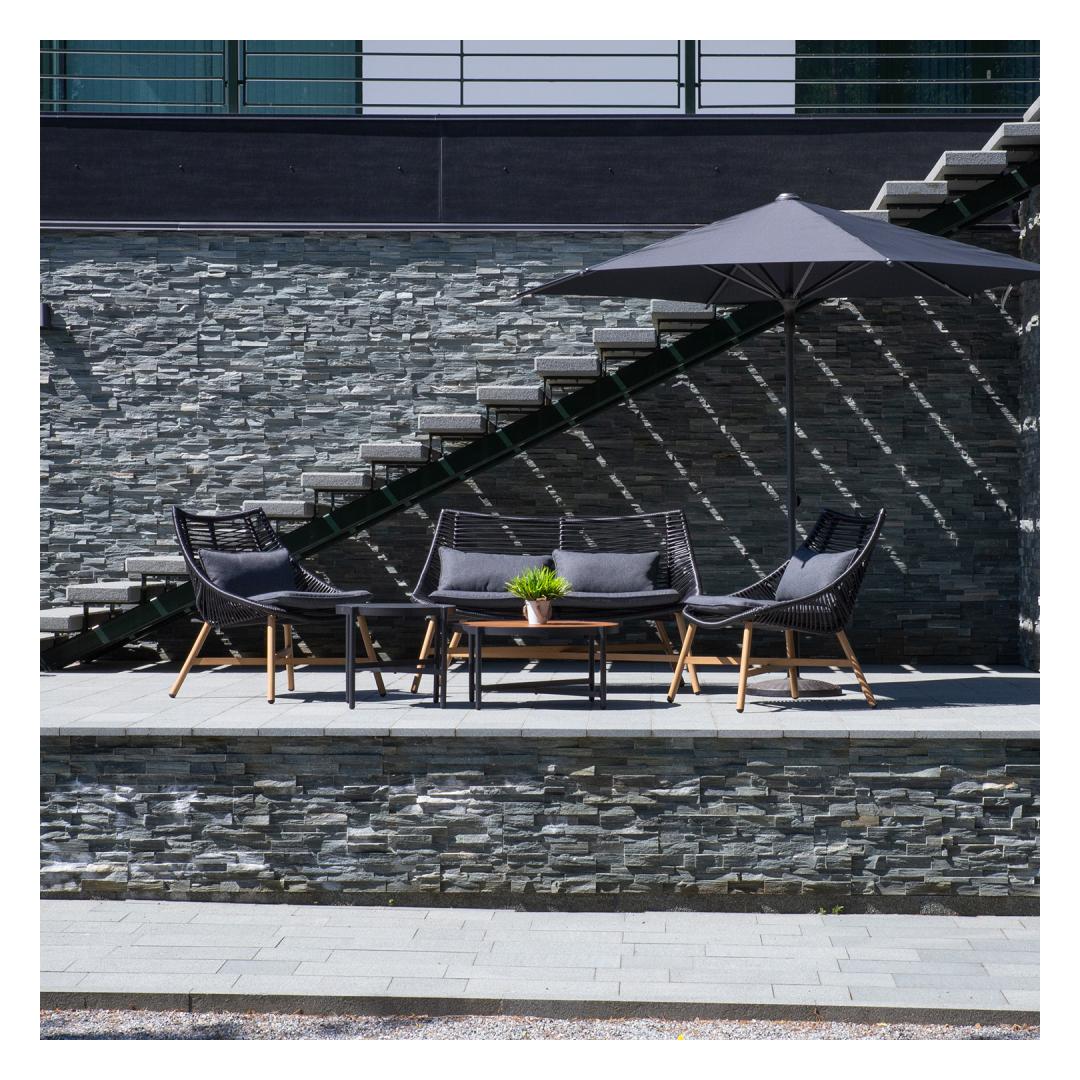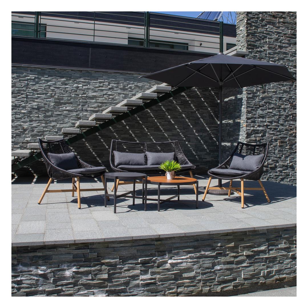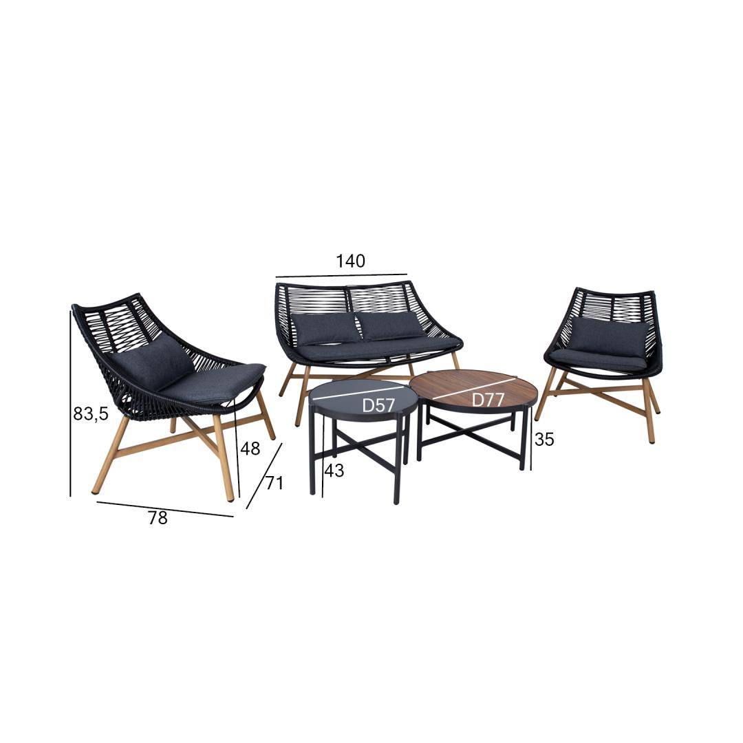 Garden furniture set HELSINKI sofa, 2 chairs and 2 tables. The legs and frames of all parts of the set are made of aluminum. The seats of the sofa and chairs are covered with black plastic braiding, the legs and base frame are hand-painted in a beige color reminiscent of teak. Seat cushions are included. The cushion covers are made of dark gray polyester fabric. The legs and base frame of the tables are finished with dark gray powder paint. Larger table top: weather-resistant high-pressure laminate with teak decor. Smaller table top: gray tempered glass. The dimensions of the sofa are 140x78xH83.5cm, the dimensions of the chair are 71x78xH83,5cm, the dimensions of the tables are D77xH35cm, D57xH43cm. The product is very durable in changing weather conditions and easy to maintain. Only cushions need protection from the weather. To extend the life of outdoor furniture, we recommend using outdoor furniture covers. STORAGE: At the end of the summer season, we recommend storing the garden furniture indoors. Clean and dry the furniture before storing. Use a dry and well-ventilated room for storage.