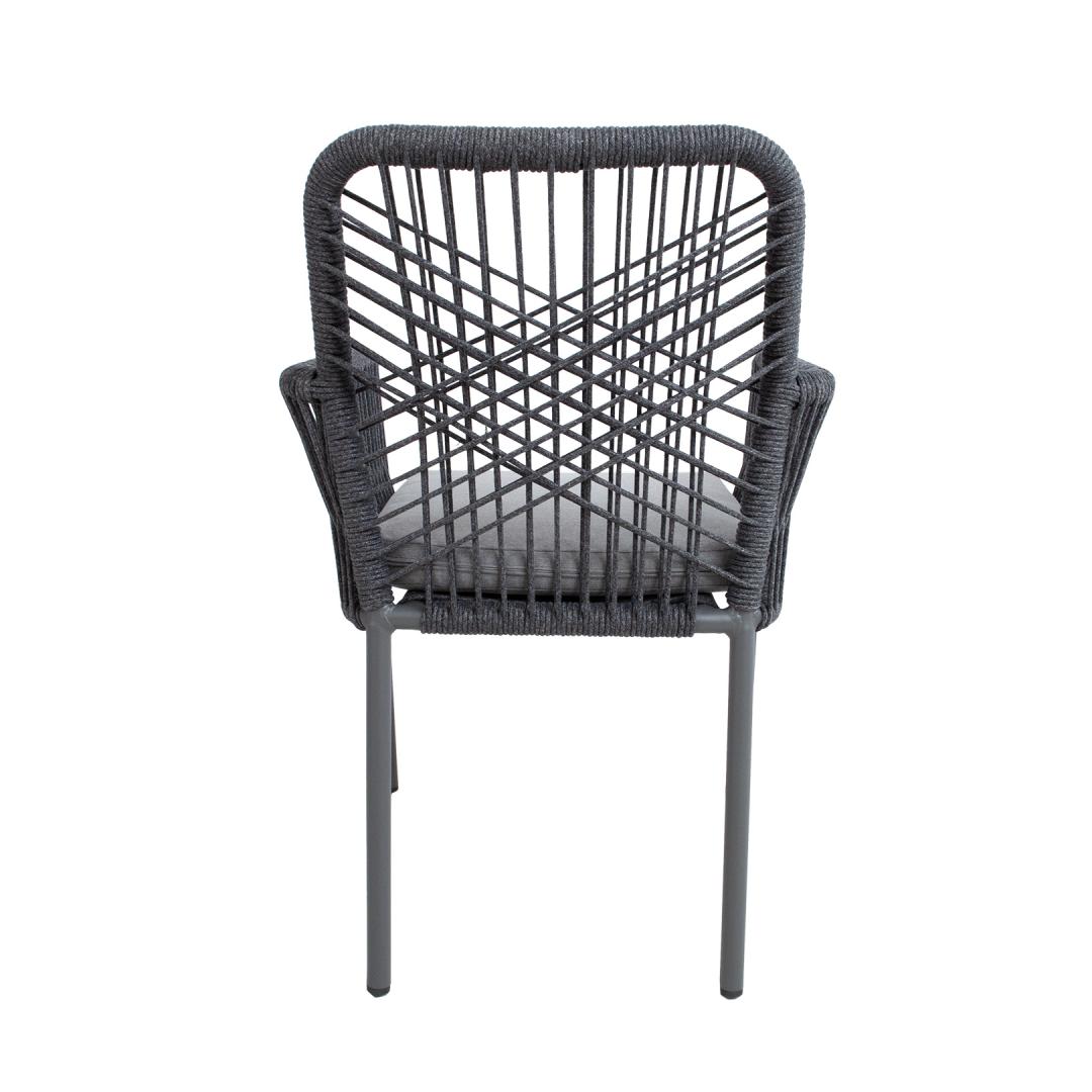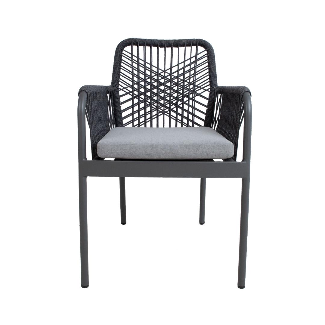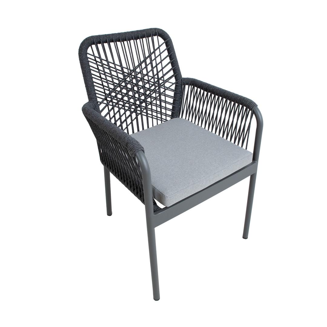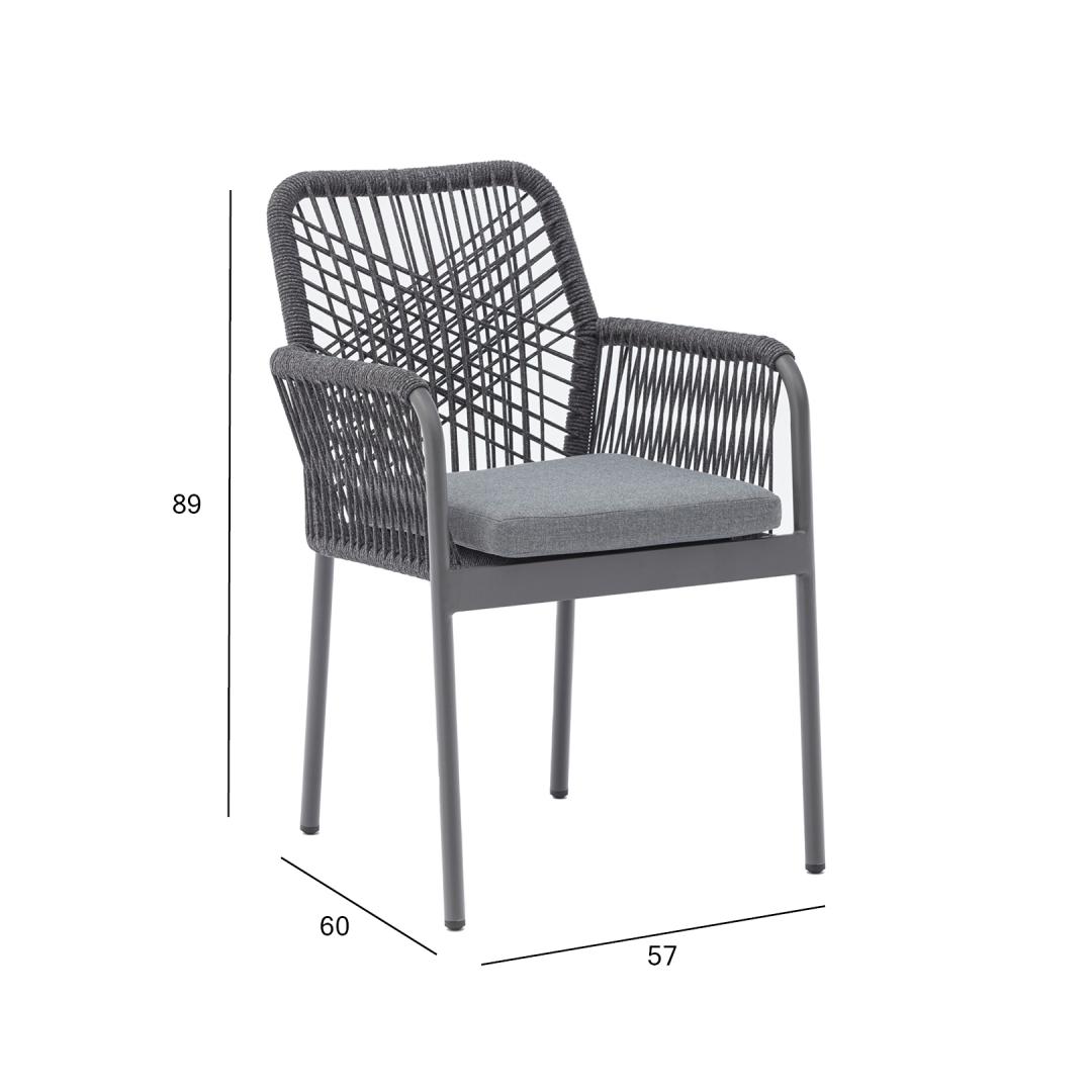 Chair HELA, grey. The frame of the chair is made of aluminum and finished with gray powder paint. The back and armrests of the chair are covered with an eye-catching olefin cord braid. The seat cushion is included. The pillow cover is made of polyester fabric. The thickness of the pillow is 5 cm. The seat base is supported by aluminum slats. Chair dimensions 57x60xH89cm, seat height 44cm. Weight limit 100 kg. The chairs are stackable and their storage is easy and space-saving. The product is durable in changing weather conditions and easy to maintain. STORAGE: At the end of the summer season, we recommend storing the garden furniture indoors. Clean and dry the furniture before storing. Use a cool, dry and well-ventilated room for storage.