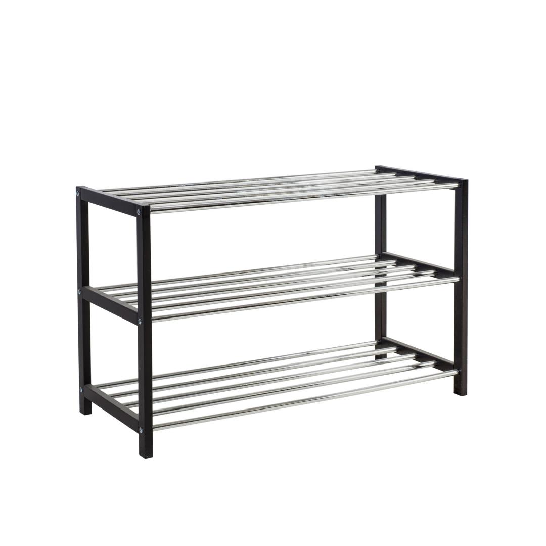 Shoe rack BRODY 3-fold 80x31xH50cm, black/chrome. The shelves are made of chromed steel tubes. The end pieces are made of wood and painted black.