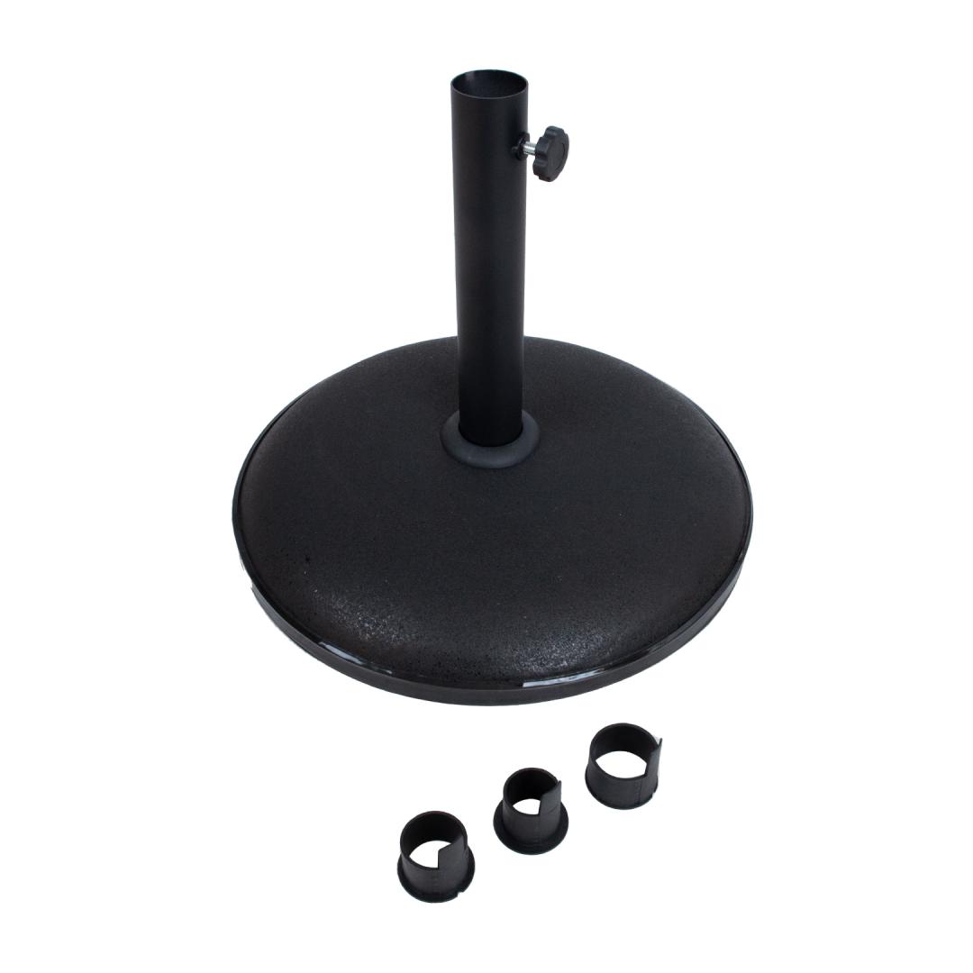 Sunshade D41.5x7cm/15kg. The sunshade is cast in concrete and painted black. The length of the steel mounting tube is 28 cm. There are 3 plastic rings D30/35/38mm at the end of the tube. Choose a ring that matches the size of the parasol leg. STORAGE: At the end of the summer season, we recommend storing the parasols indoors. Use a dry and well-ventilated room for storage.