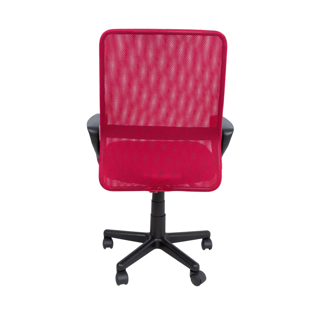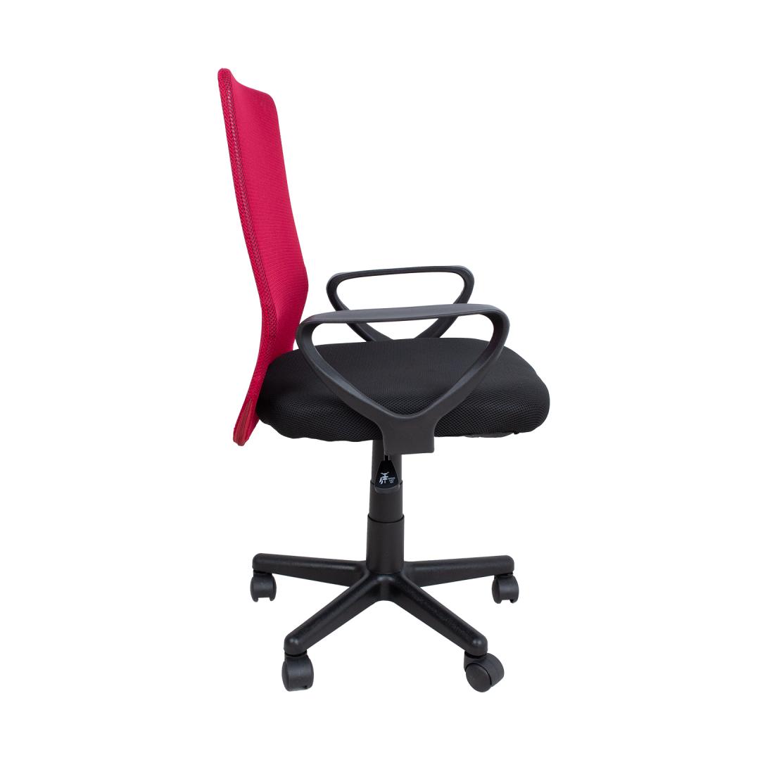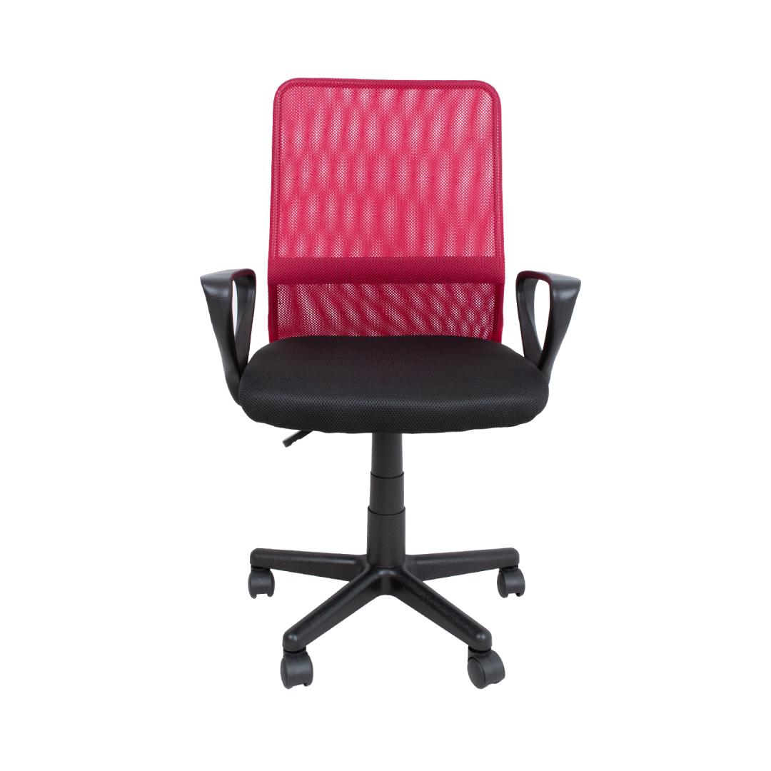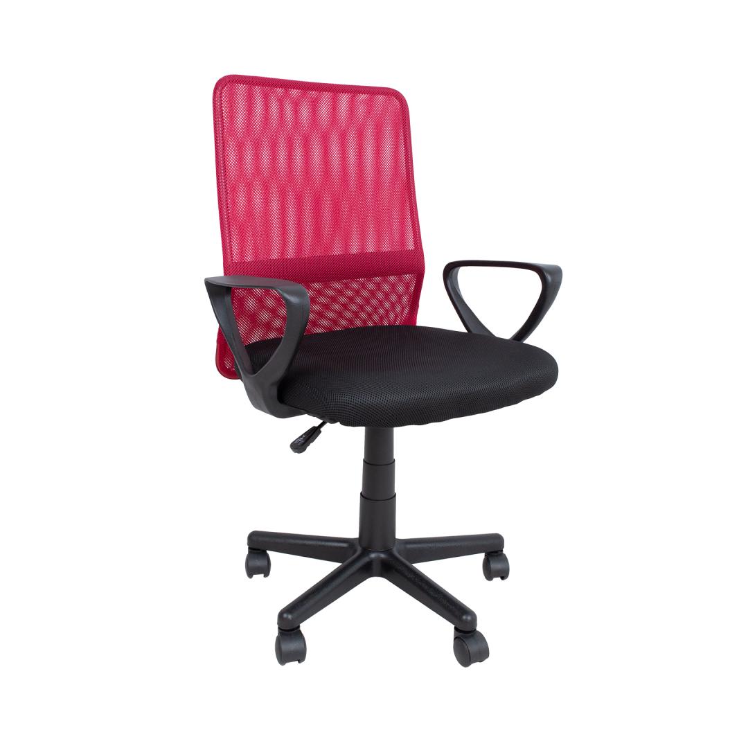 Office chair BELINDA black/red. The lightly padded chair seat is covered with polyester fabric. The backrest is covered with polyester mesh fabric. The height of the seat is adjustable using a gas damper. The armrests are made of black plastic. The 5-pronged footrest is made of black plastic, R27cm. The chair has plastic wheels, 50mm. Chair height is 86.5-98.5cm, seat width 46.5cm, seat depth 46.5cm, backrest width 44cm, backrest height 55.5cm. Product dimensions are 59x56xH86.5-98.5cm. The weight limit of the chair is 80 kg.