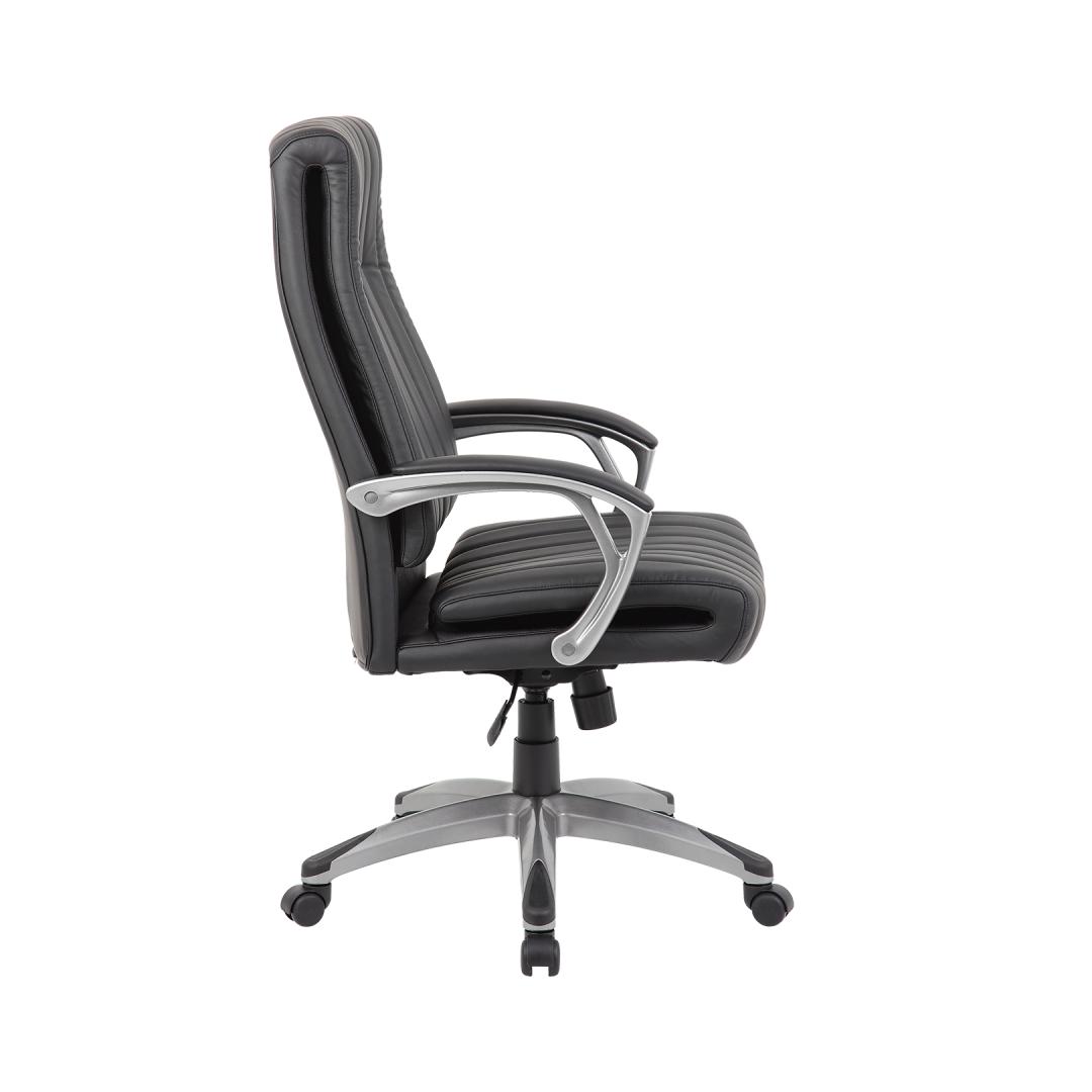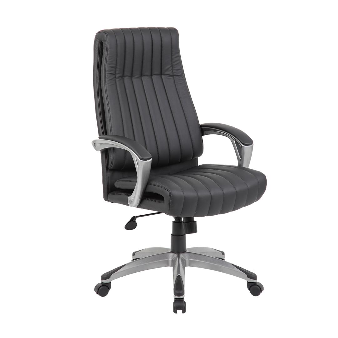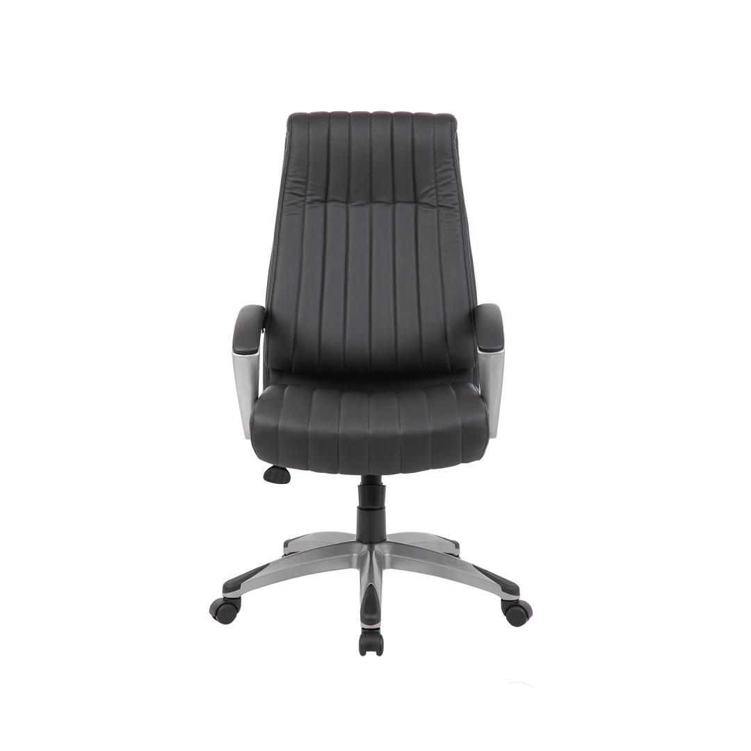 Work chair ELEGANT black. The seat and backrest are covered with black artificial leather. The color of the chair frame is black. The chair has a synchronous mechanism. The stiffness of the swing can be adjusted according to the weight of the sitter. The height of the seat is adjustable using a gas damper. The plastic armrests are padded and covered with artificial leather. The footrest is made of black plastic. The chair has plastic wheels, pin: 11mm. The height of the chair is 112-119.5 cm. The dimensions of the product are 62.5x76.5xH112-119.5cm. The weight limit of the chair is 120 kg.