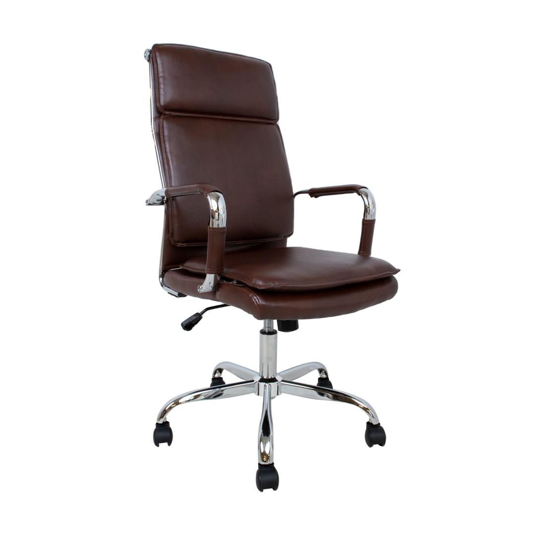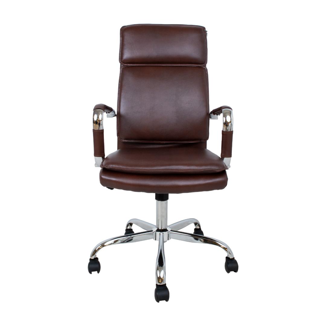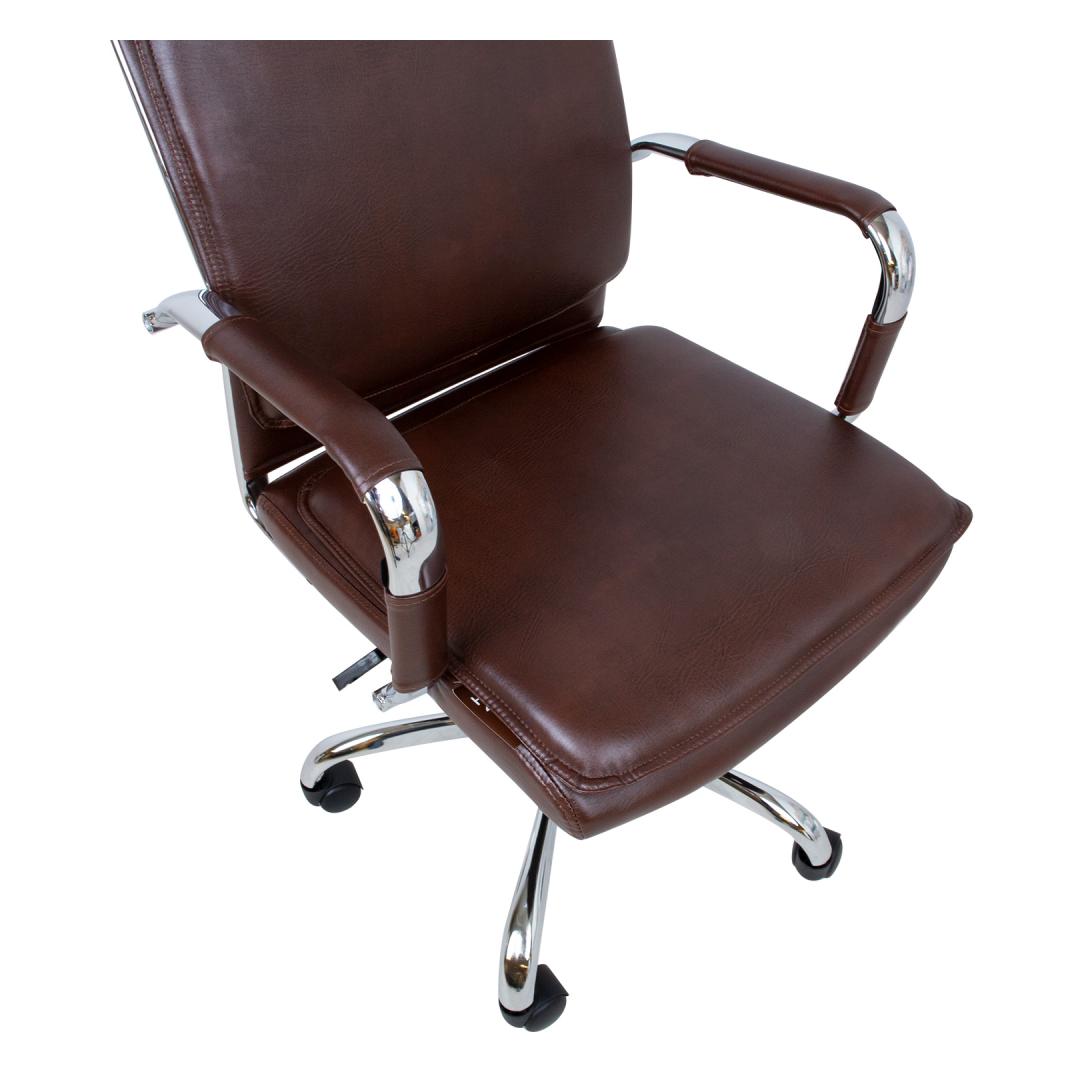 Task chair ULTRA, brown artificial leather. The seat and back of the chair are covered with brown artificial leather. The chair has a swing mechanism and pneumatic seat height adjustment. The chromed armrests have artificial leather covers. The chair has a 5-prong chromed footrest R32cm and plastic castors D50mm. The overall dimensions of the chair are 54,5x60xH106,5-116,5cm, the width of the seat is 46,5cm, the depth of the seat is 47,5cm. The width of the backrest is 45,5cm, the height of the backrest is 66cm. Weight limit 100kg.