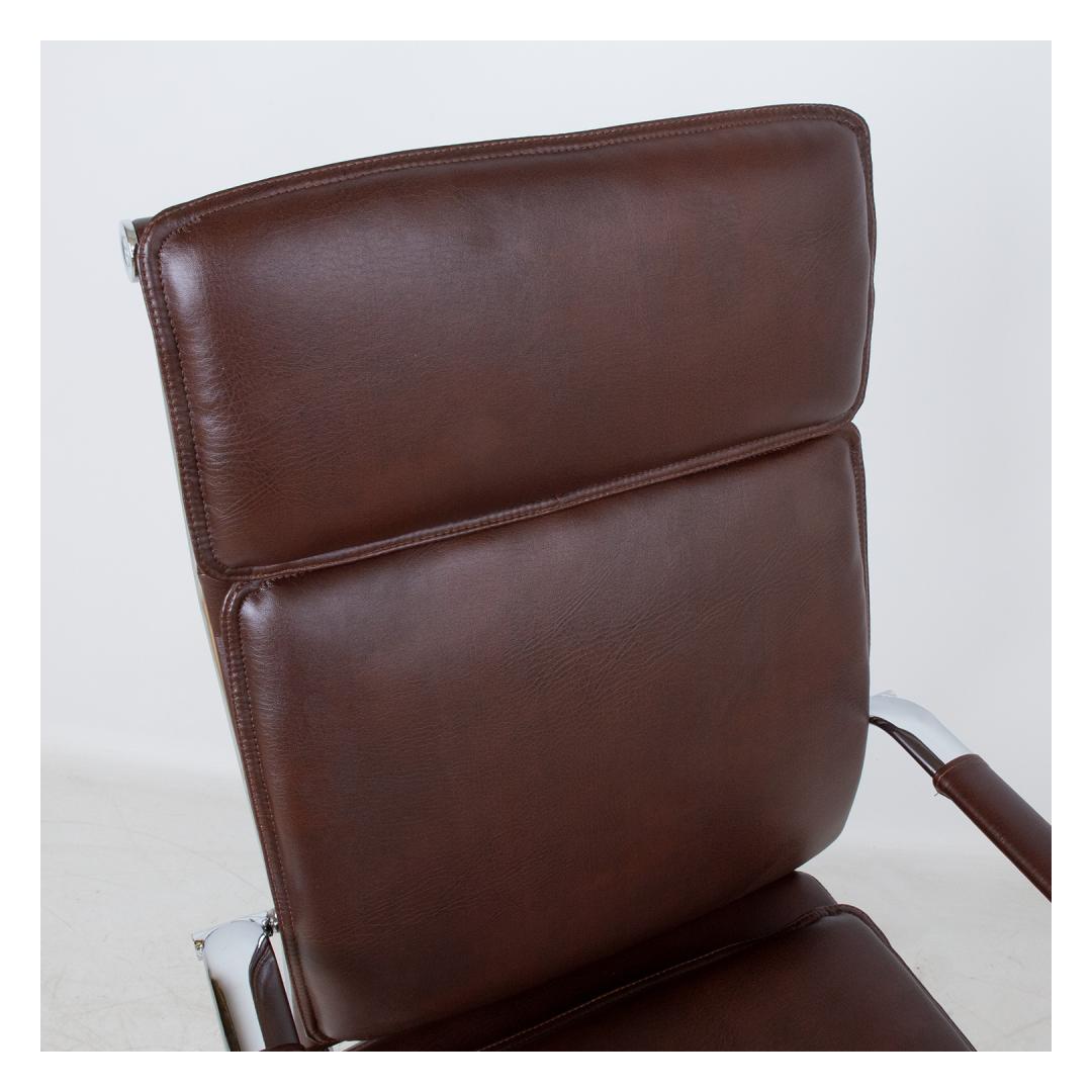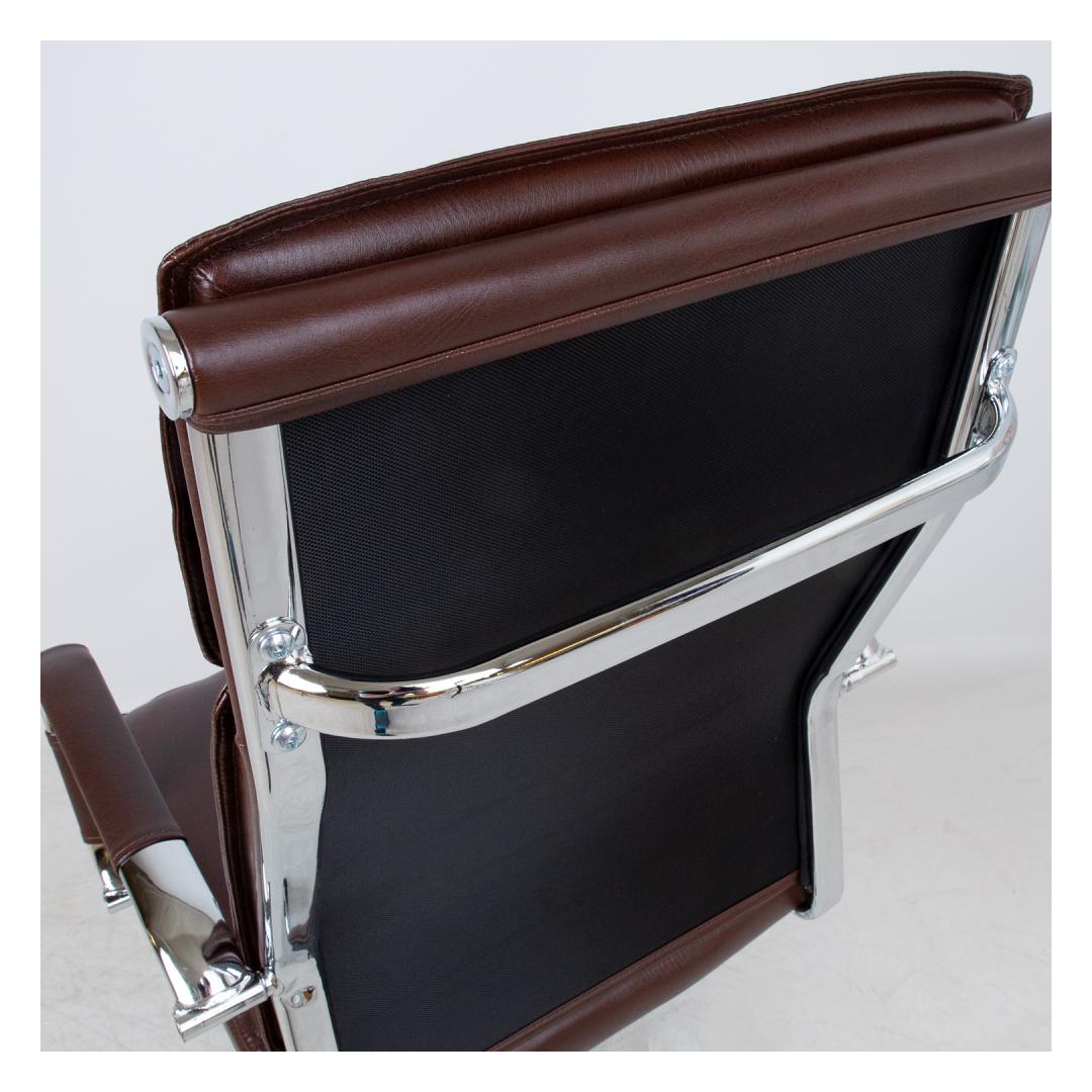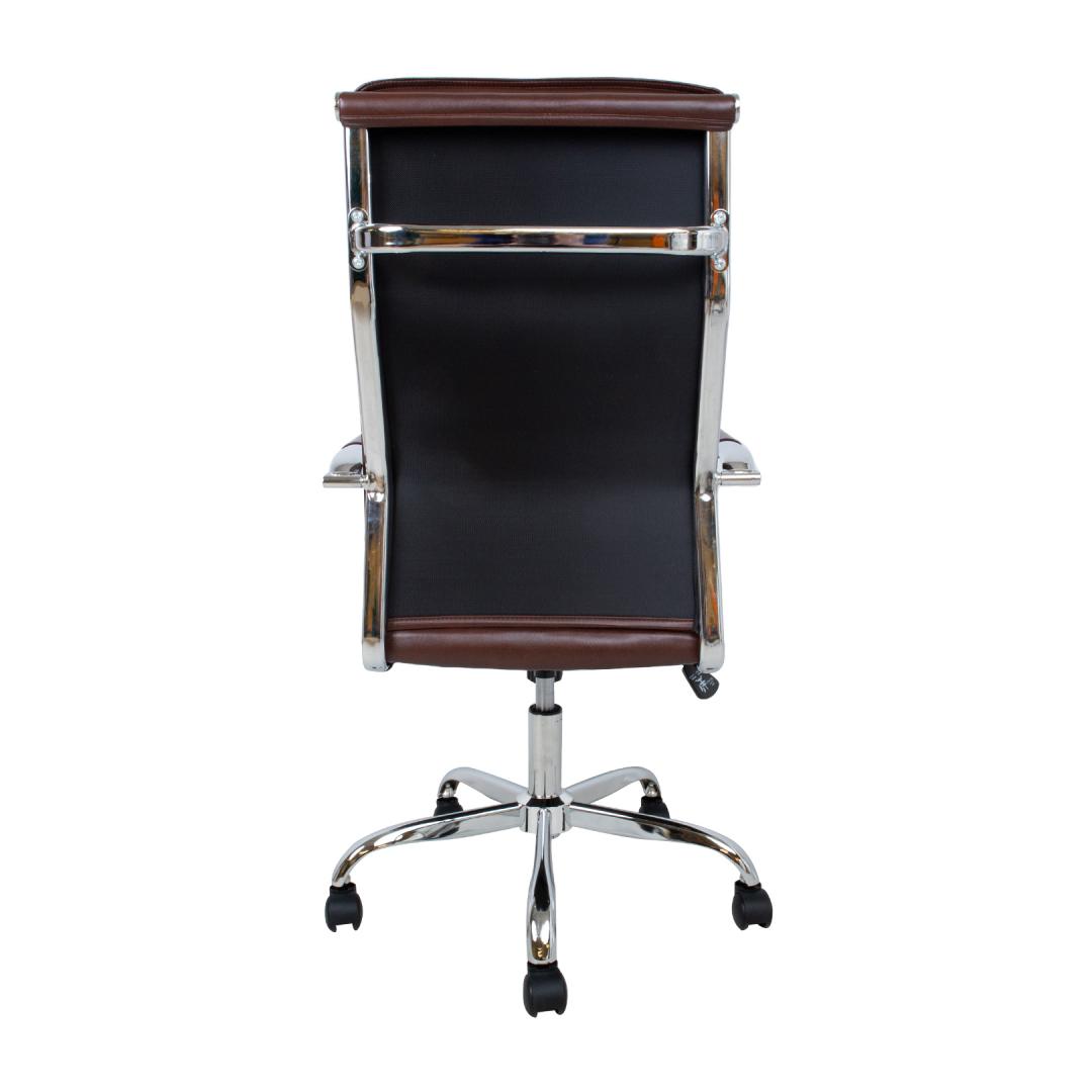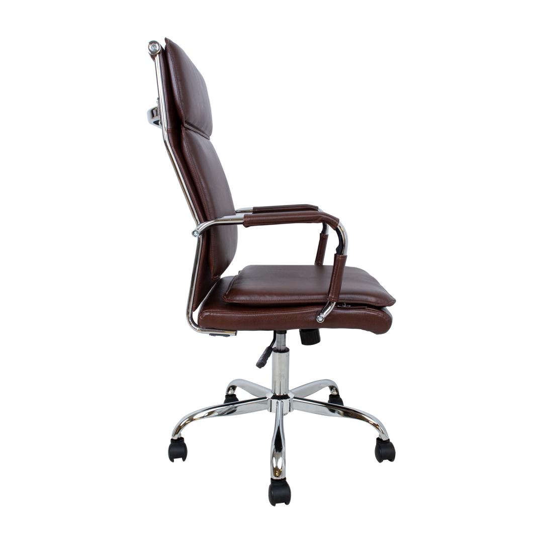 Task chair ULTRA, brown artificial leather. The seat and back of the chair are covered with brown artificial leather. The chair has a swing mechanism and pneumatic seat height adjustment. The chromed armrests have artificial leather covers. The chair has a 5-prong chromed footrest R32cm and plastic castors D50mm. The overall dimensions of the chair are 54,5x60xH106,5-116,5cm, the width of the seat is 46,5cm, the depth of the seat is 47,5cm. The width of the backrest is 45,5cm, the height of the backrest is 66cm. Weight limit 100kg.