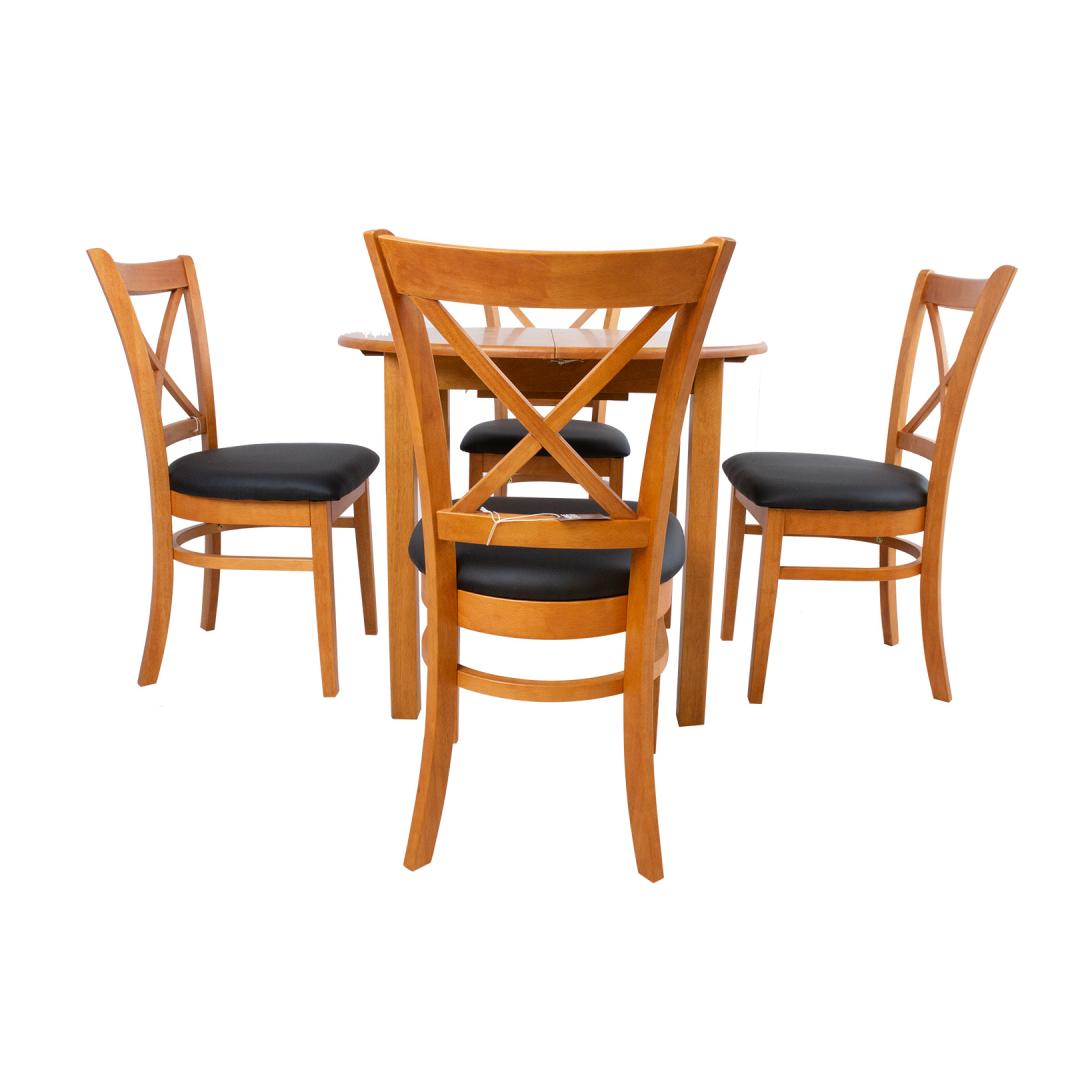 Dining table set MIX & MATCH extendable table and 4 chairs. The dimensions of the table are D90+30xH74cm. The table is made of rubber wood and finished with light oak-colored lacquer. The table top opens in the middle and the extension is placed between the two halves. A 30 cm wide foldable intermediate plate is placed under the table top. The dimensions of the chair are 43x43xH90.5cm. Upholstered seat covered in black artificial leather. The rubber wood legs and frame are finished with light oak lacquer. Weight limit 100 kg.