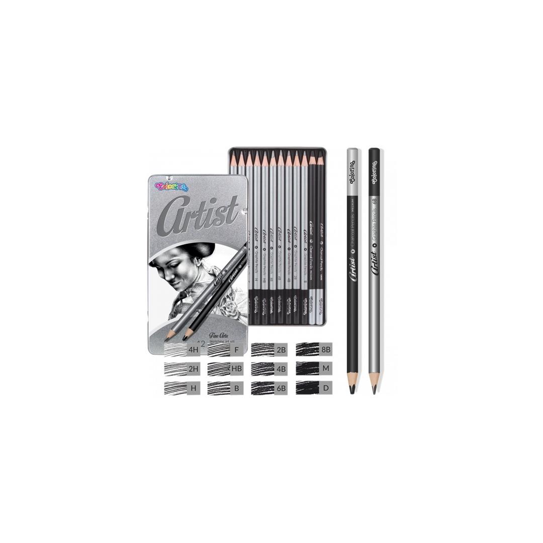 The set includes: graphite pencils in 10 degrees of hardness and carbon